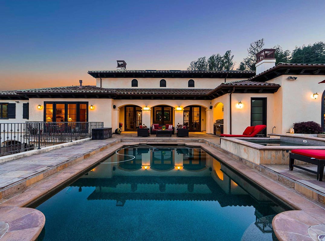 The estate’s expansive grounds offer a wealth of amenities, including a bocce court, greenhouse, raised garden beds, a custom playground, a two-story treehouse with suspension bridge, pool & spa with designated bath, and multiple outdoor dining and lounge spaces.