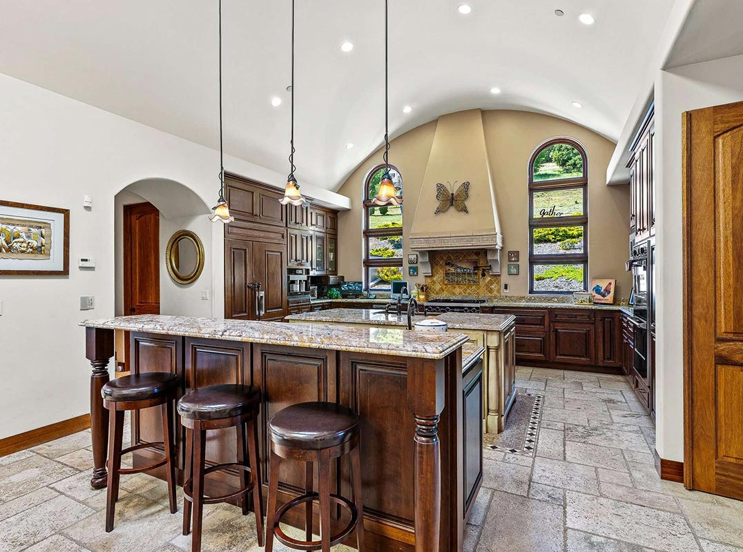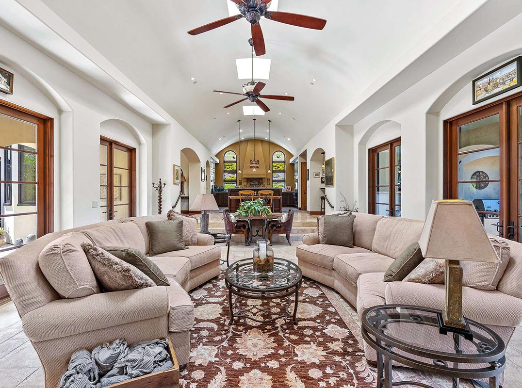 The spacious great room flows effortlessly into a chef’s kitchen with other spaces including a formal dining room, family room and a pass-through bar opening to a built-in BBQ center beside the resort-style pool overlooking the picturesque landscaping.