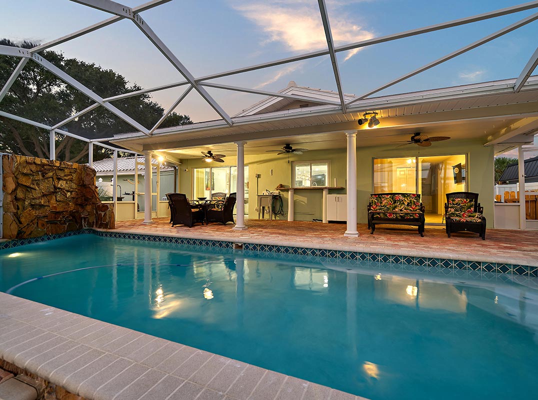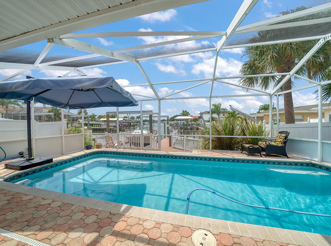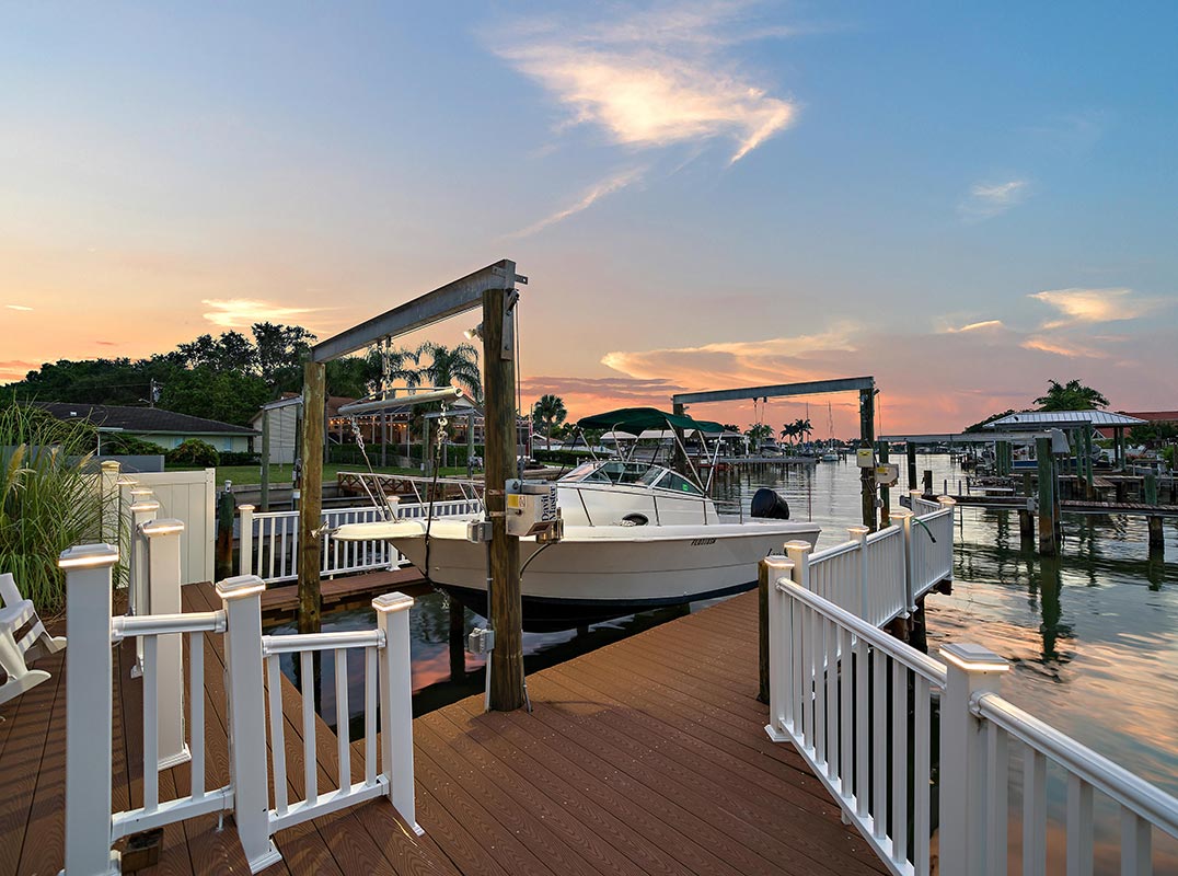 Discover the epitome of luxury living in this waterfront residence nestled within the desirable Harbor Hills community. Set on a large corner lot with a circular driveway, this home boasts tropical landscaping and a covered front porch that adds to the curb appeal. Enter through double leaded glass front doors, setting the tone for the exquisite interior that awaits. An open floor plan and neutral color palette create an inviting ambiance. The living area features an electric fireplace that adds warmth and elegance to the space. The split bedroom plan offers a full guest or in-law suite with a separate entrance, complete kitchen, washer/dryer, and sliders that offer picturesque pool and water views; making it perfect for income potential. The designer kitchen boasts stainless steel appliances, including a gas cooktop, quartz countertops, pull-out drawers, Lazy Susans, and a pull-out spice cabinet. A large island overlooks the dining room and living room with a wet bar providing extra seating and the perfect place to gather. Each guest bedroom features its own ensuite bath, beautifully appointed and generously equipped with ample closet space. The lavish primary bedroom offers French doors that overlook the spacious yard, crown molding, and a gorgeous ensuite with an extra-long Jacuzzi tub, shower, double vanity sinks, and custom tile work. Sliders in the family room create a seamless transition to the enclosed patio and heated salt-water pool complete with waterfall for endless hours of entertainment and relaxation enjoying the breathtaking water and sunset views that enhance the tranquility of waterfront living. Venture to the new dock with electricity, a 10,000 lb lift and davits, creating a boaters' paradise with easy access to the Intracoastal Waterway. Additional features include loads of storage including a large side yard for boat trailer storage, etc., a floor safe, a full house alarm system with 7 cameras, and remote access for added peace of mind. This beautiful home is located in close proximity to sparkling beaches, top-rated restaurants, shopping, and two airports ensuring a lifestyle of convenience and leisure.