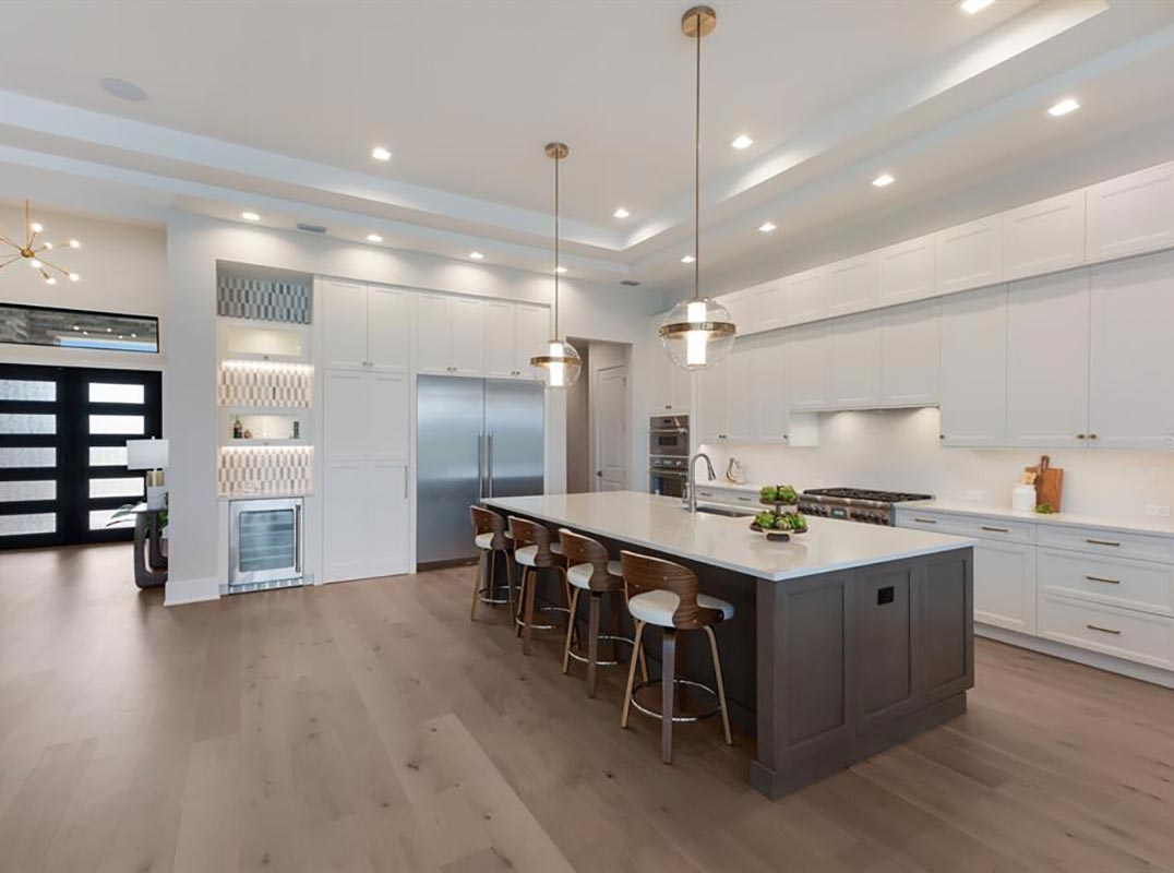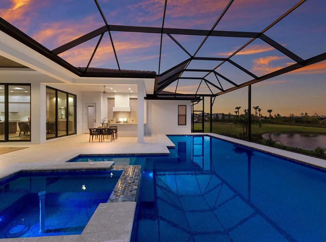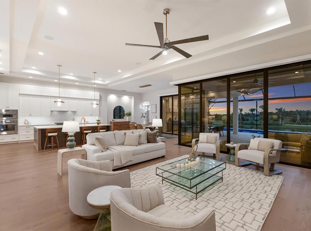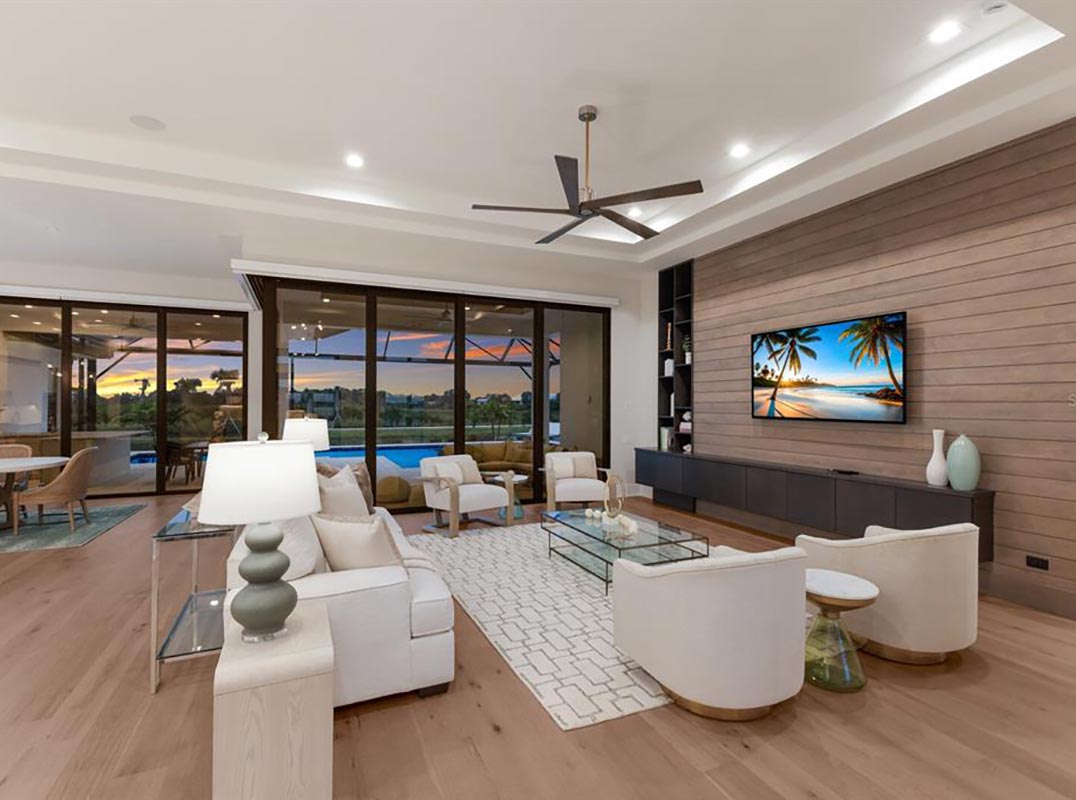 expansive 2,136 square foot outdoor retreat featuring open and under cover spaces with shellstone pavers, soaring ceilings, full summer kitchen and bar, PebbleTec heated saltwater pool/spa with sun shelf, panoramic clearview screen, and pre-plumbed for outdoor fire pit/table. Ten-foot impact glass walls seamlessly connect the resort-styled outdoor space to a grand great room with soaring ceilings, sumptuous engineered wood flooring, and a show stopper feature wall. Dinner guests are treated to an open feel surrounded by vast doors and serene vistas overlooking the lake and preserve beyond. Meanwhile chefs will delight in the open kitchen with uncompromising wood cabinetry and accent tile, sprawling quartz counters, all high-performance appliances, two ovens, two refrigerator drawers, under counter wine fridge, and an oversized hidden pantry room with built-in cabinetry shelving with a full-size second refrigerator.