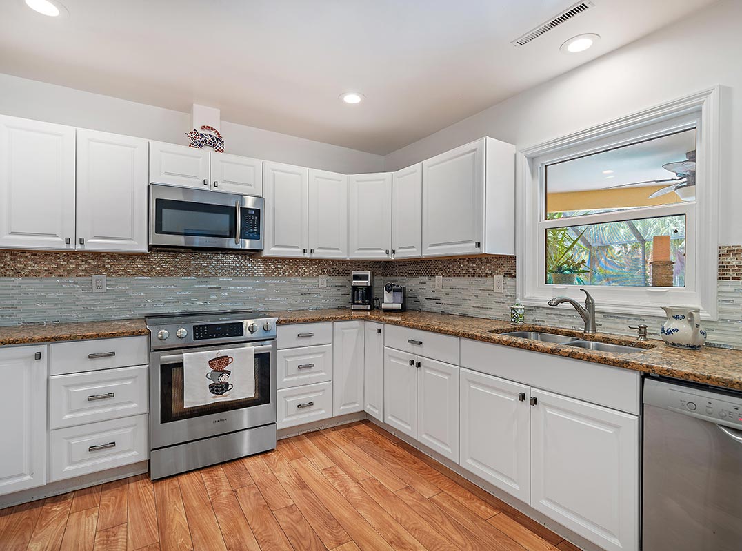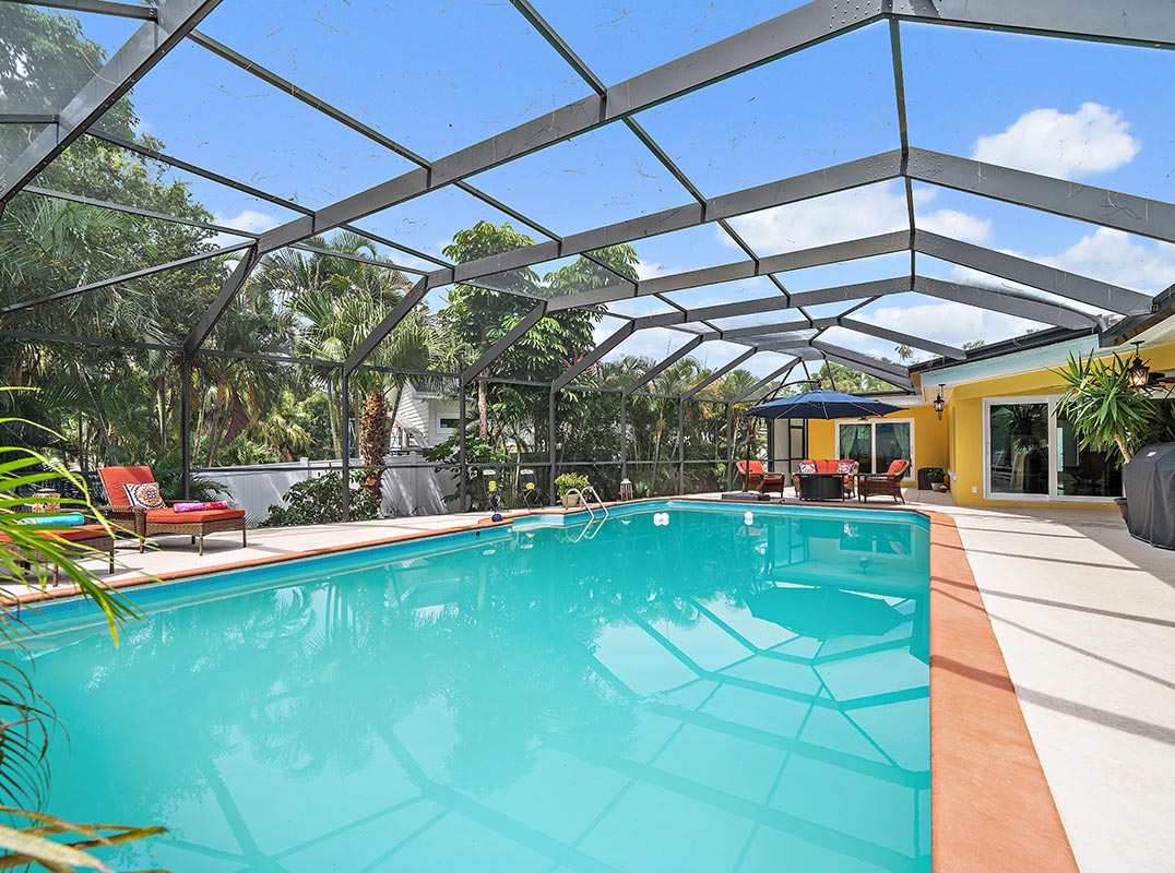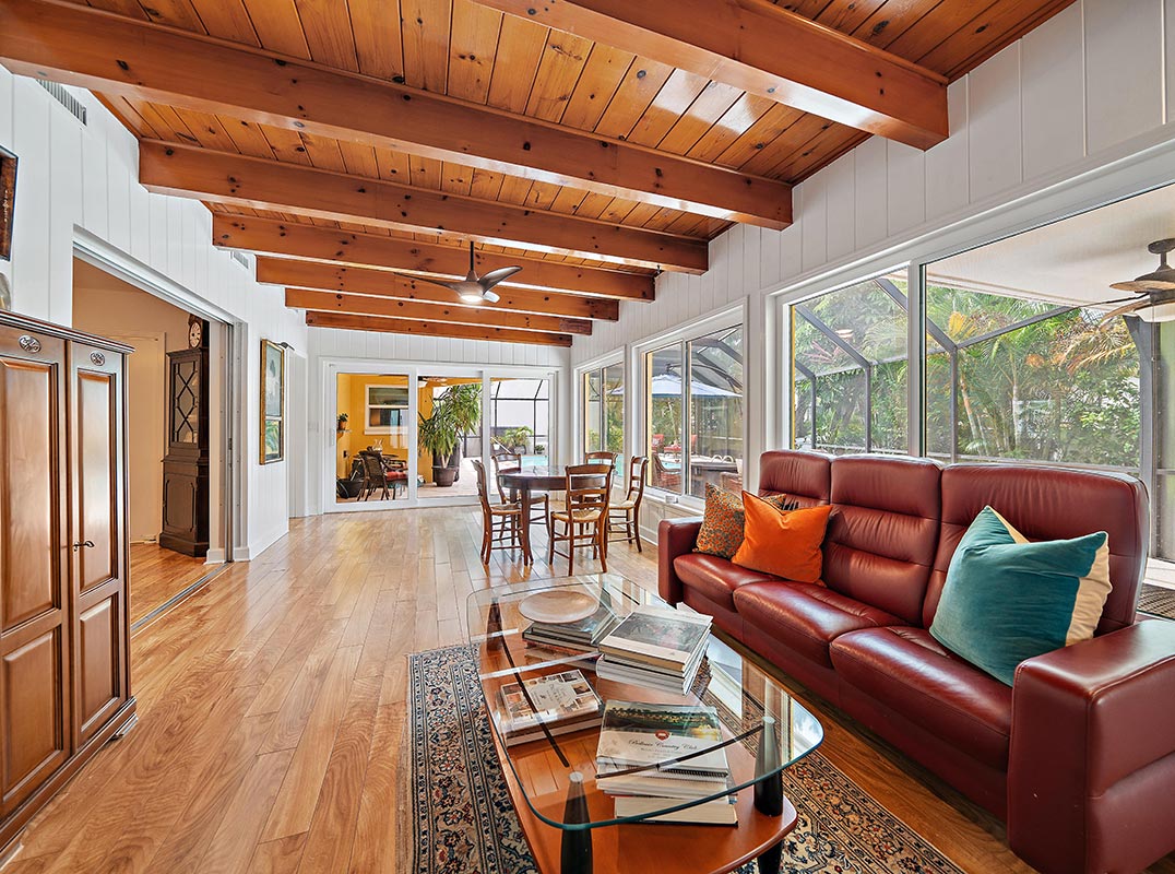Move-in ready and perfectly positioned in the heart of beautiful Belleair, this stunning home offers refined Florida living just one block from the water and beautiful Winston Park, yet sits high and dry in a non-flood zone. Bursting with curb appeal, this meticulously maintained home features tropical native landscaping, a newly pavered front walkway and patio, and a welcoming entryway. Inside, a bright and open floor plan is enhanced by designer finishes, neutral luxury vinyl flooring, and a seamless flow between spacious living areas. The living room is filled with natural light, boasts electric blinds, and is anchored by a striking wood-burning fireplace, while the adjacent dining room connects effortlessly to the gorgeous white kitchen with stainless steel appliances, granite countertops, custom tile backsplash, wine fridge, and pass-through to the pool. The family room stuns with white paneled walls and soaring pine ceilings with exposed beams, creating an unforgettable atmosphere. Sliders open to a private, lush backyard oasis, where you will find expansive outdoor living that is a perfect blend of luxury and functionality, including 2 distinct covered areas, each offering a unique retreat, and a large shimmering pool with a 10 foot deep-end. Encasing the pool is a soaring screen enclosure providing protection from leaves and insects while maintaining an open, breezy atmosphere. The primary suite is a peaceful retreat with a walk-in custom closet, natural light, private glass door to the pool, and an ensuite featuring a furniture-inspired vanity and walk-in shower. Additional bedrooms are equally well appointed with custom closets, and built-ins. Extras include a 3-car garage with new custom flooring, impact windows and sliders, whole house generator, and electric blinds, Situated in one of Pinellas County’s most desirable neighborhoods, you're just minutes from two private golf clubs, boutique shopping, local dining, and the area's most beautiful beaches. Don’t wait—this Belleair beauty won’t last long!