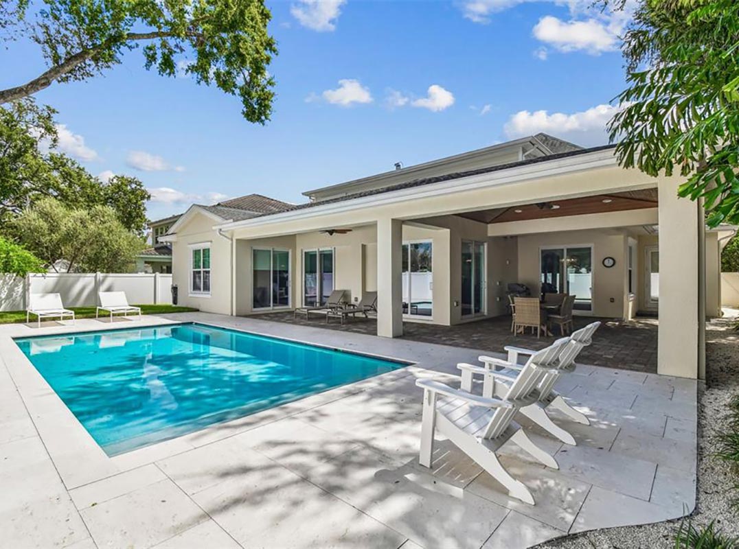 The private first-floor primary suite is a serene retreat with vaulted ceilings, paneled walls, and direct access to the pool and lanai. Its spa-like bath includes a walk-in glass shower with dual shower heads, a freestanding soaking tub, dual vanities with storage, and a spacious walk-in closet. A second first-floor bedroom and full bathroom offers flexibility as a guest room or dedicated office. Upstairs, you'll find three generously sized bedrooms—each with walk-in closets and custom lighting—two full bathrooms, and a versatile loft area perfect for play, study, or relaxation. Attic access is available through the mechanical room for additional storage. Step outside to discover the ultimate outdoor lounge—virtually hidden from the rest of the house and other outdoor living spaces. Complete with a cozy gas fireplace, large built-in TV, stained wood ceilings, and ceiling fans, it’s the perfect setting for gameday gatherings or relaxing movie nights. The expansive backyard lanai features travertine decking, a gas feed and vent ready for your dream outdoor kitchen, and a 392-square-foot in-ground concrete pool (installed in 2017) surrounded by vinyl fencing and a grassy play area. Open space behind the property offers tranquil views of the ever-changing sky, adding to the sense of privacy and serenity. Located just minutes from top-rated restaurants, shopping, Palma Ceia Golf and Country Club, and only half a mile from Plant High School this home is a rare blend of craftsmanship, comfort, and coastal charm. Schedule your private showing today and experience the lifestyle you’ve been dreaming of.