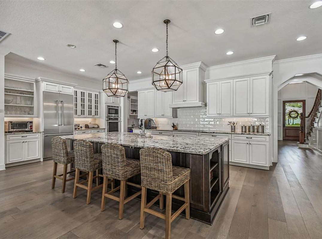 Welcome to this stunning Craftsman-style estate in the highly sought-after Golfview neighborhood of South Tampa. This meticulously designed 5-bed, 4-bath home offers over 4,200 square feet of heated living space and more than 1,100 sq. ft. of covered outdoor areas. Built in 2016 on a 75x100 lot in Flood Zone X, the home features a split 3-car garage with ample guest parking. From the moment you arrive, the home makes a grand impression with its covered front porch, wooden staircase, paneled walls, and abundant natural light. Inside, you'll find hurricane-impact sliding glass doors and windows, rich crown molding, coffered ceilings, and custom light fixtures throughout. The formal dining room sets a refined tone, while the dry bar and arched entryway lead you into the heart of the home: an open-concept kitchen, breakfast nook, and great room designed for both everyday living and entertaining. The oversized island is the centerpiece of the space, and customized with Thermador appliances, a walk-in pantry, built-in butler’s pantry/wet bar, and a large mudroom/laundry room with sink and ample storage.