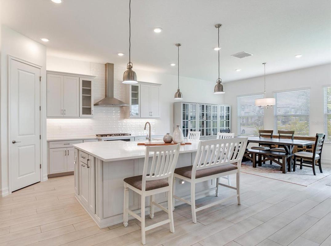 Welcome to refined Florida living at 6057 Marsh Trail Drive, nestled within the exclusive, gated community of Tarramor Estates in Odessa. This 2023-built, modified Amberly floor plan offers 5 bedrooms, 4 baths, and 3,615 square feet of beautifully designed living space—all set on a spacious .28-acre lot with peaceful lake views. From the moment you arrive, the curb appeal is undeniable. A barrel tile roof, full gutters, California Color Package, coach lighting, and lush professional landscaping frame the home, while a full-lite, obscure glass front door offers a warm welcome. Step inside to soaring 10-foot ceilings, wood-like tile flooring, and a seamless, open-concept layout. The heart of the home is the designer kitchen, featuring Level 4 Calcutta Gold Silestone countertops, GE stainless steel appliances, a 36” gas cooktop, built-in wall oven and microwave, 42” Alpine-painted cabinetry with crown molding, soft-close drawers, custom pull-outs, and an apron-front farmhouse sink. A full-height custom backsplash and an oversized island with ample seating complete the space. The large walk-in pantry with ventilated wood shelving is a chef’s dream. A formal dining room is perfect for entertaining, while sliders from the main living area open to a covered patio overlooking the lake—offering ample backyard space for a future pool.