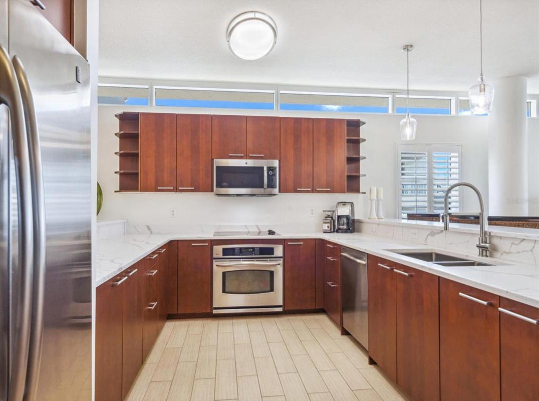 Spectacular, rarely available gulf-front living at Crescent Siesta Key. Savor endless Gulf of Mexico views and world-renowned Siesta Beach’s powdery white sands from this luxurious three-bedroom, three-bath, turnkey-furnished residence in Crescent Siesta Key. Positioned with a desirable southwest exposure, this exceptional condominium blends elegant coastal style with thoughtful design across nearly 2,200 square feet of climate-controlled living space. Towering 11.5-foot ceilings and transom windows flood the open floor plan with natural light, while custom finishes and soft contemporary décor create an atmosphere of effortless sophistication. The chef’s kitchen is a culinary dream, featuring Poggenpohl cabinetry, sleek stone countertops, bar-height seating and abundant pantry storage, all opening seamlessly to the spacious great room and dining area.