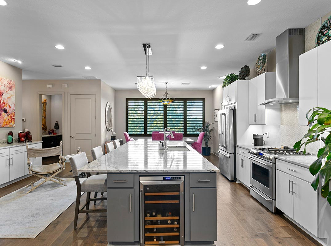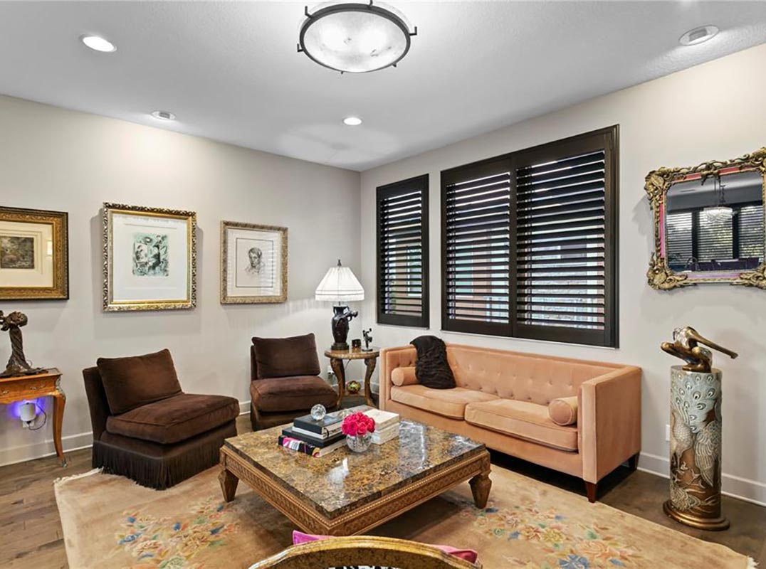 chandeliers cascade through every level, transforming light into art and everyday moments into cinematic experiences. The ground floor offers endless possibilities: a private guest suite, creative studio, or quiet retreat from the city. Ascend the plush staircase to discover an