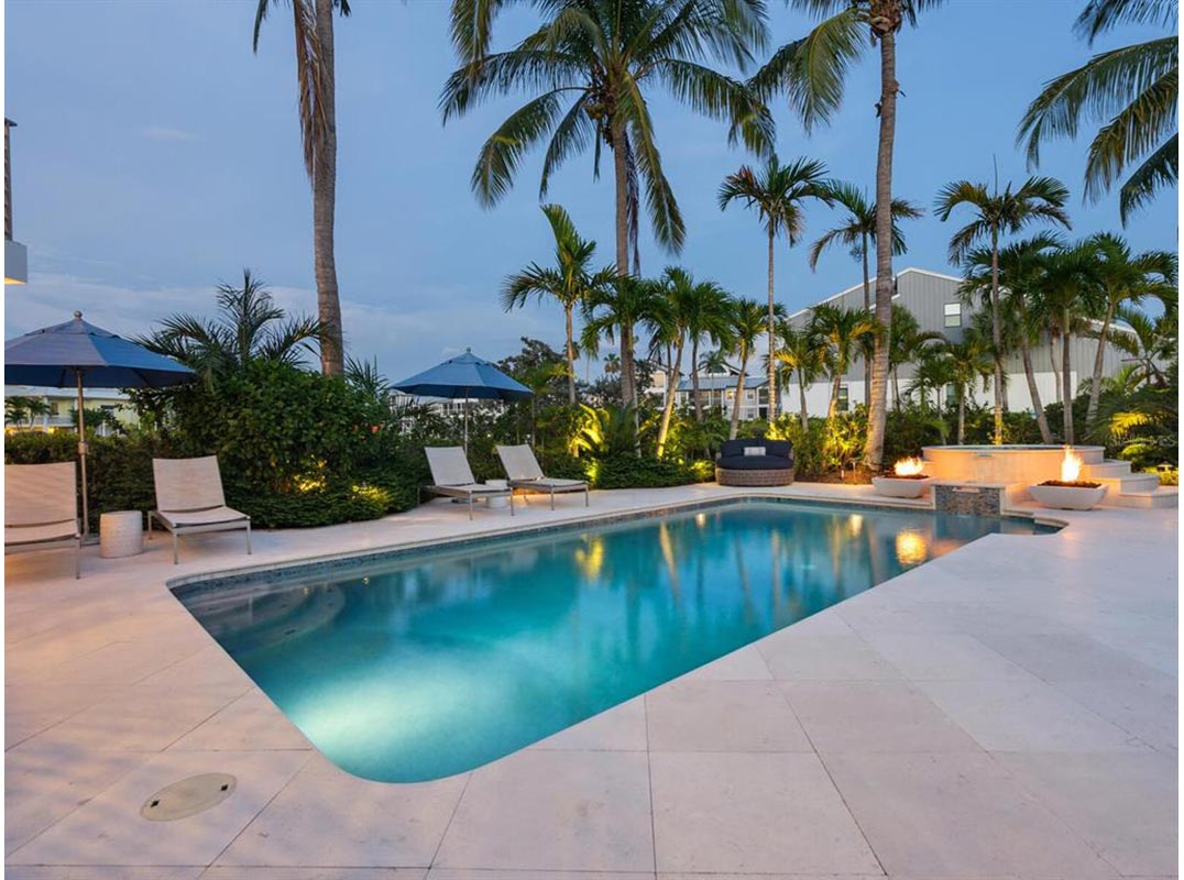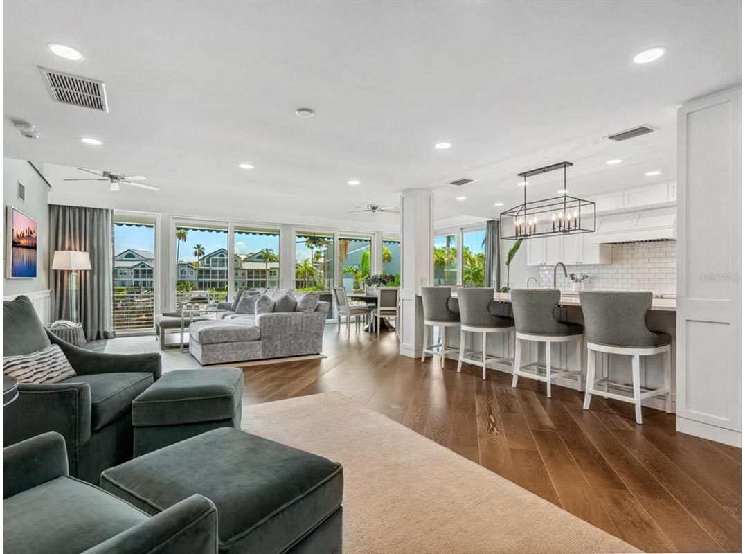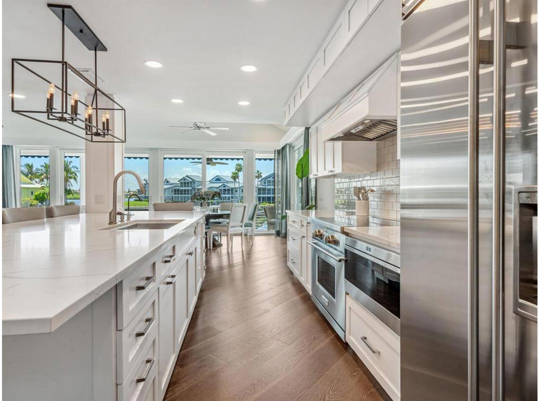 When home feels like a permanent vacation, every day becomes a tropical escape where time slows down, the water is always nearby, and every day begins and ends with a coastal breeze. That’s the essence of 5727 Riegels Point—a casually luxurious, resort-style property where the lifestyle is as effortless as it is extraordinary. Nestled within the gated enclave of Riegels Landing on Siesta Key, an exclusive community with fewer than 30 estate homes, this unique property offers a lifestyle where outdoor living is as exceptional as the interior. Step into your own island sanctuary, surrounded by 357 feet of deep-water shoreline on a private basin with direct Intracoastal access. It’s a true boater’s paradise, complete with two 10,000-lb boat lifts, a floating kayak launch, water and electricity at the dock, and lit pilings perfect for nighttime fishing. The water is deep enough for a large-scale yacht to sit comfortably at your dock. Expansive Shellstone patios wrap around the home, offering countless spaces to relax, dine, and entertain. The saltwater pool and raised spa, framed by fire and water features anchor this private resort experience. Remote smart controls make it easy to unwind in the pool and spa after a sunset cruise. The front entry showcases coastal curb appeal with double frosted glass doors, leading into an interior that blends casual sophistication with the ease of turnkey living. The great room is open and airy, with engineered wood floors and abundant natural light. Large sliders provide seamless access to the outdoor amenities, creating a perfect space for both entertaining and casual relaxation. The chef’s kitchen is designed for both form and function, featuring Wolf cooking appliances, a Sub-Zero refrigerator, a Miele dishwasher, a galley sink, and custom cabinetry throughout. Hidden outlets at the cabinet base and multiple pantries, plus clever storage built into the island, keep everything organized with ease. The primary suite is a serene retreat with engineered hardwood floors, a access to a waterfront terrace with Trex decking that wraps around the entire home, and well-thought-out blind and electrical automation. The luxurious bath features lighted mirrors, dual sinks, a makeup vanity, a free-standing tub, a walk-in shower, and a Toto commode. The suite also includes a spacious walk-in closet with custom built-ins. Upstairs, two generous guest suites share a well-appointed full bathroom. Two loft areas provide the perfect space for reading, working, or relaxing. The lower level offers a multifunctional space, featuring a living space, fitness room, sliders to access the outdoor space, and a wine room with plumbing for a cooler. Additional features include a spacious 2-car garage with custom built-ins, Control4 smart home technology for lighting, AV, security, and more, four HVAC zones for comfort, turnkey furnishings, a whole-house water softener system (salt and carbon filters), a whole house generator and an oversized laundry room with custom organization. At 5727 Riegels Point, enjoy island living with easy access to Sarasota and Siesta Key Village’s dining, shopping, and entertainment. Siesta Key Beach, recently named the No. 1 beach in America by Tripadvisor, is just moments away, offering powdery sand, clear waters, and stunning sunsets. From dockside mornings to poolside evenings, this is coastal living at its best—a full-time escape where your dream lifestyle unfolds.