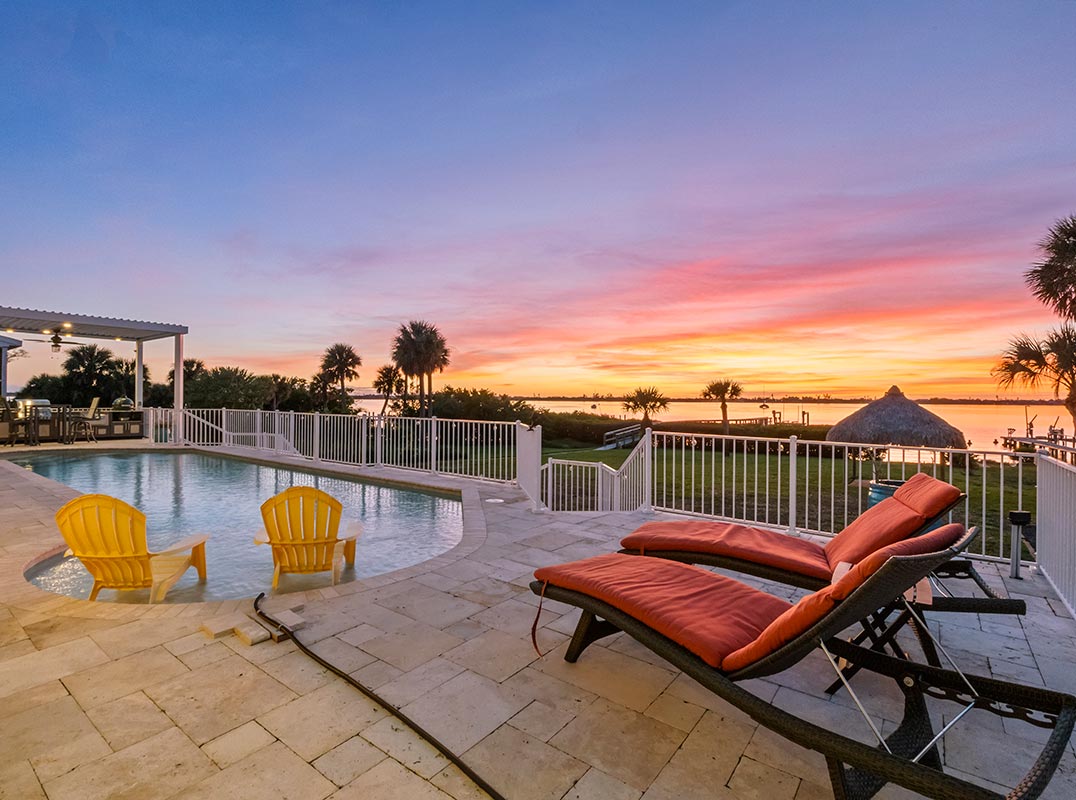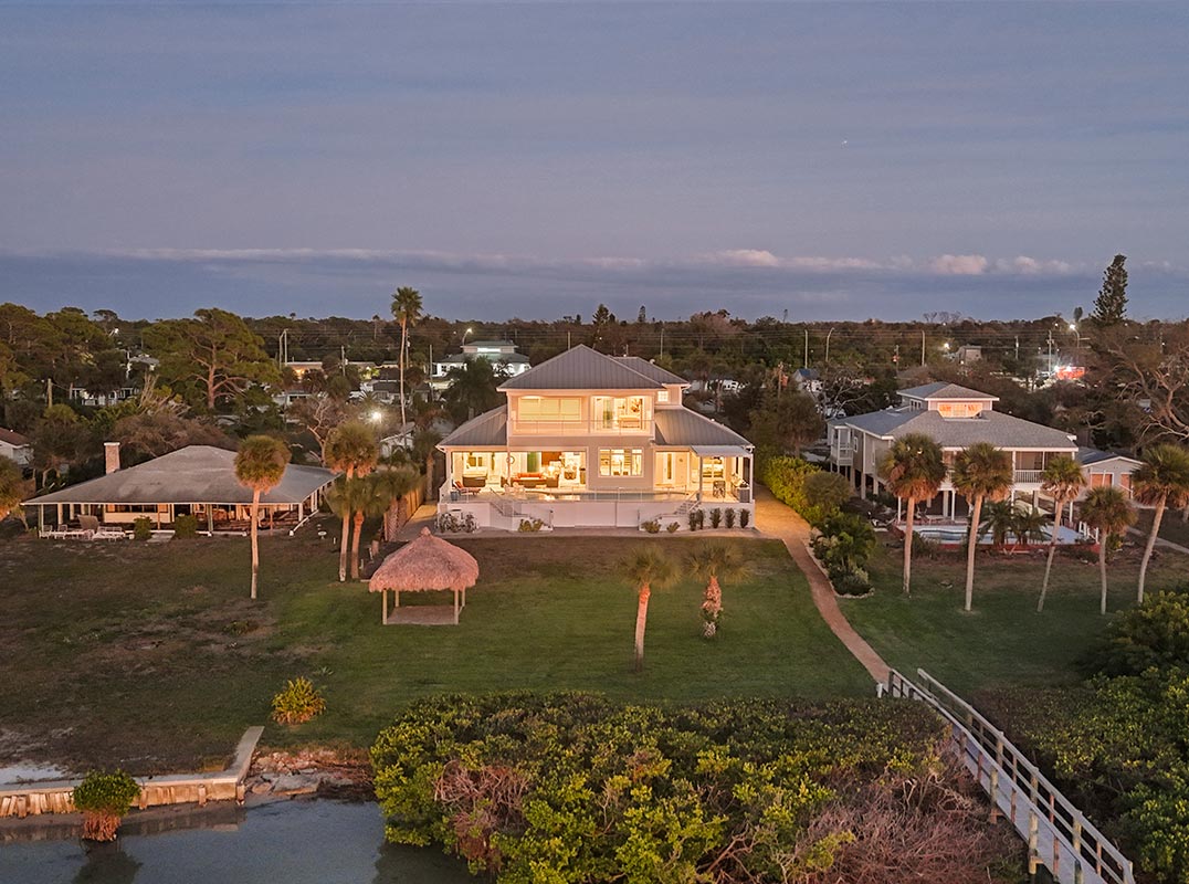 Outdoor living shines with a travertine pool deck, large heated, saltwater pool, hot tub, and a large, electric pergola shading the outdoor kitchen. A 170-foot dock with a 16,000-lb boat lift, grandfathered tiki hut, make this a true boater’s paradise. Also features hurricane windows & doors with shutters to enclose the back lanai, standing seam metal roof, Hardie plank siding and tons of extra storage.