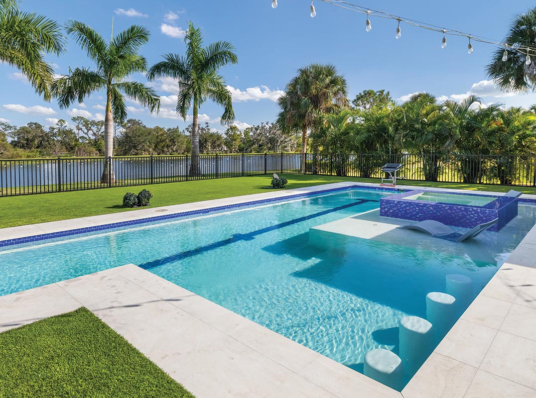 Expansive sliding glass doors disappear to reveal an outdoor living sanctuary with a resort-style pool featuring a lap lane, sun shelf, raised spa, submerged seating, fire-pit lounge, and a covered lanai with fireplace and full summer kitchen. Full smart-home automation controls lights, climate, audio, security, and pool systems, supported by $250K+ in A/V upgrades and impact windows and doors throughout.