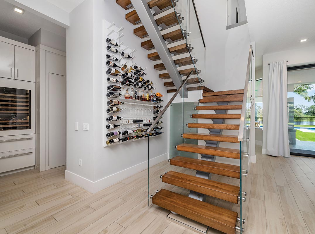 A dramatic glass-and-wood floating staircase and feature wine wall set the tone for the sleek interior, where soaring ceilings, designer lighting, and expansive glass showcase peaceful lake and preserve views.