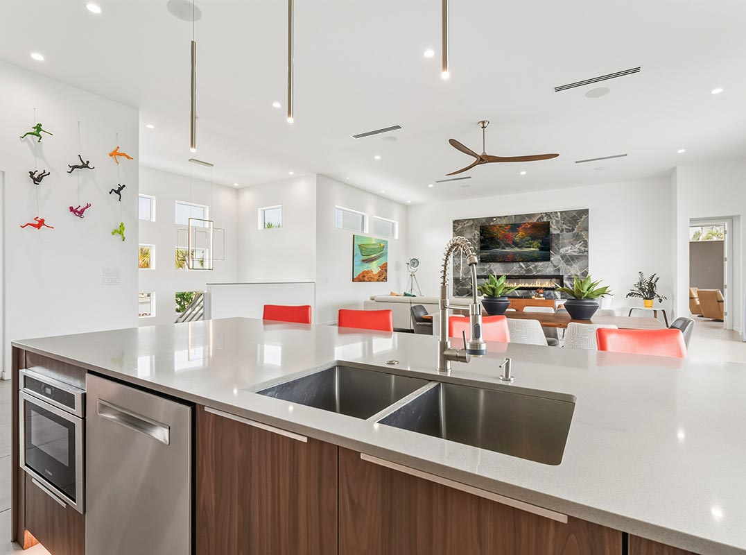 Designed with crisp architectural lines and a light-filled, contemporary aesthetic, this nearly 3,800-square-foot, four-bedroom, four-bath home redefines modern coastal living. An open floor plan, 12-foot ceilings, and expansive walls of impact-resistant glass windows and doors create a natural flow throughout the home, blurring the line between indoors and out while capturing the relaxed elegance of island life. A dramatic natural rosewood floating staircase serves as a sculptural centerpiece, leading to the main living level where modern design and functionality converge. The living area is anchored by a 100-inch electric floating wall and linear fireplace, creating a striking focal point for both everyday living and entertaining. Modern LED lighting, thoughtfully integrated throughout the interior and exterior, enhances the home’s clean lines and architectural presence.