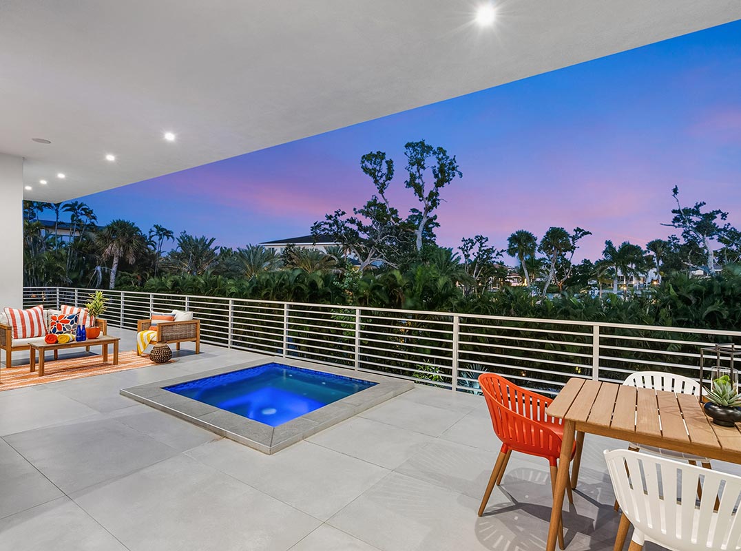The primary suite is a tranquil retreat, highlighted by a spa-inspired bath with LED, anti-fog mirrors, a 74-inch soaking tub, and a walk-in closet, along with direct access to outdoor living. Three additional guest suites are thoughtfully designed to offer comfort, privacy, and flexibility, each with designer finishes and modern baths. One of the home’s most distinctive features is the private balcony with a spa-style hot tub —perfectly positioned for morning relaxation, evening unwinding, or enjoying coastal breezes after a day at the beach.