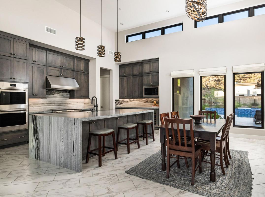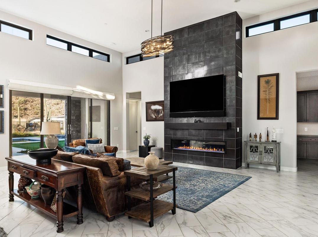 Stunning contemporary home, located in the heart of gated Adero Canyon, is a sanctuary of comfort & elegance presenting an opportunity to experience the best of high-end desert living. The modern architectural design with stone finishes and crisp, clean lines perfectly complements the natural desert backdrop of Sonoran Desert & mountain vistas, creating a welcoming appeal for discerning tastes. Spanning 3708 square feet and including an attached oversized casita, the open-concept Toren model living areas flow effortlessly with the use of premium materials and neutral tones creating a sense of organic luxury and calming ambiance. Marble-like tile floors, 15-foot ceilings, modern chandeliers and lighting, flat roman shade window treatments throughout and a state-of-the-art Control4 home system set the stage for a sophisticated lifestyle with a great room centered around a floor-to-ceiling tile surround linear fireplace, ideal for hosting guests or enjoying quiet moments. The modern kitchen is nestled nearby, with an oversized marble waterfall island providing additional seating & storage. Featuring premium appliances including Wolf dual ovens, 6-burner gas range and SubZero refrigerators, custom oak cabinets, & high-end finishes that reflect the home's modern aesthetic. Whether preparing a casual meal or hosting a dinner party, this space is designed to impress.