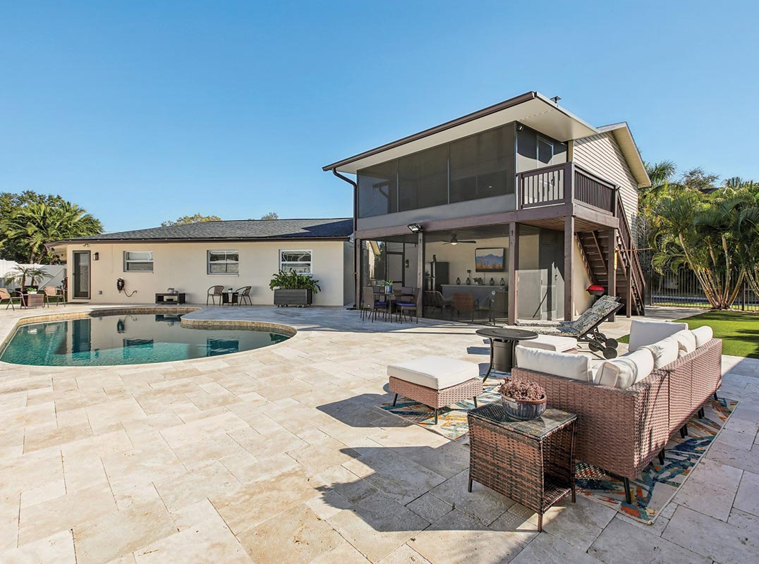 Step outside to the beautiful pool area and the detached 2 car garage plus guest quarters. The garage has epoxy flooring, an A/C and heat unit and an attached screened porch overlooking the pool. Upstairs over the garage is a completely updated GUEST QUARTERS that you enter by its own separate private entrance. At the top of the stairs, you pass through the screened porch into the 625 sf air conditioned living space just perfect for guests, extended family OR make this an income producing AirBNB. This unique bonus space has a full bath, mini-kitchen, washer and dryer and a flexible floorplan. You will love enjoying the low maintenance fully fenced backyard. The large, deep pool has been resurfaced with Pebble Tech and new travertine coping and deck pavers. Walkable to the Tampa Bay MARINA for the BOATING Enthusiast. The entire home and garage has new roofing and gutters. This is truly a move-in ready home!