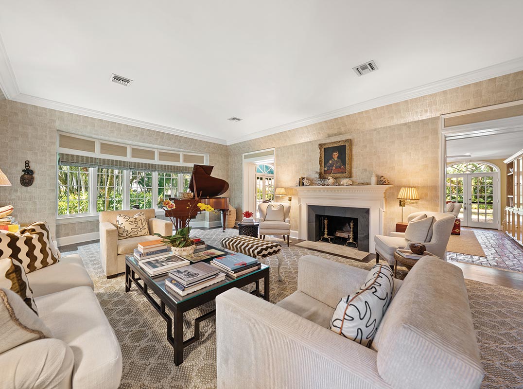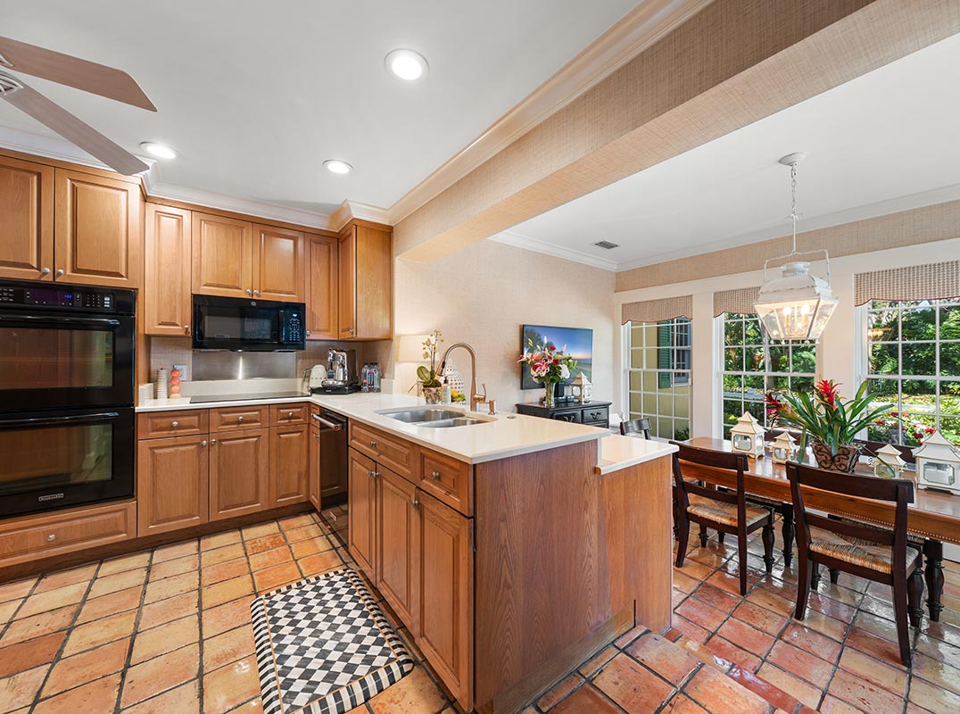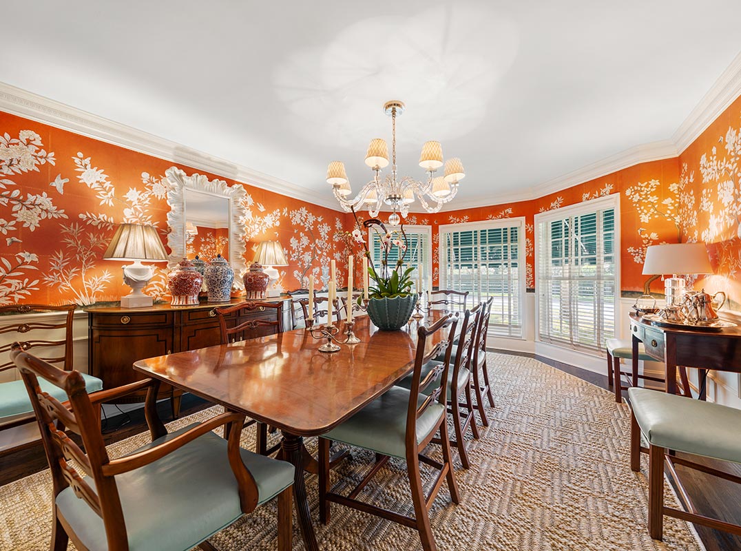 The formal dining room makes a bold first impression with striking wallpaper and seamless access to the kitchen—perfect for hosting memorable gatherings. The spacious dine-in kitchen is both functional and refined, offering abundant counter space, a large pantry, and easy access to a peaceful courtyard where morning coffee feels like a daily escape. The sophisticated formal living room is centered around a fireplace and framed by abundant windows that showcase the beautifully maintained ½ acre lot. The adjacent family room features another fireplace and a convenient wet bar for effortless entertaining.