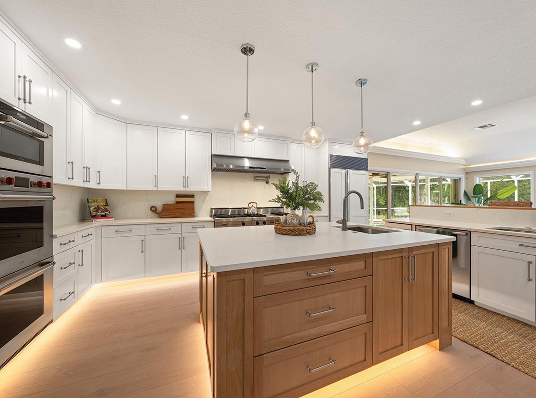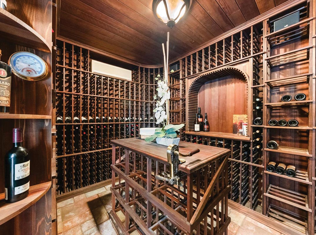 The newly updated downstairs features a new wrap-around deck, fresh flooring and paint, two dedicated home offices, and a chef's dream white kitchen equipped with a Viking gas range, new 5 foot stainless hood, Wolf double ovens, a walk-in pantry, a huge center island with prep sink, and a waterfall-edge breakfast bar. The kitchen flows seamlessly into a spacious family room with custom built-ins, a fireplace, and access to a massive custom cedar-lined wine cellar perfect for entertaining. The formal dining room, framed by walls of floor-to-ceiling windows, overlooks the enclosed pool and serene backyard.
