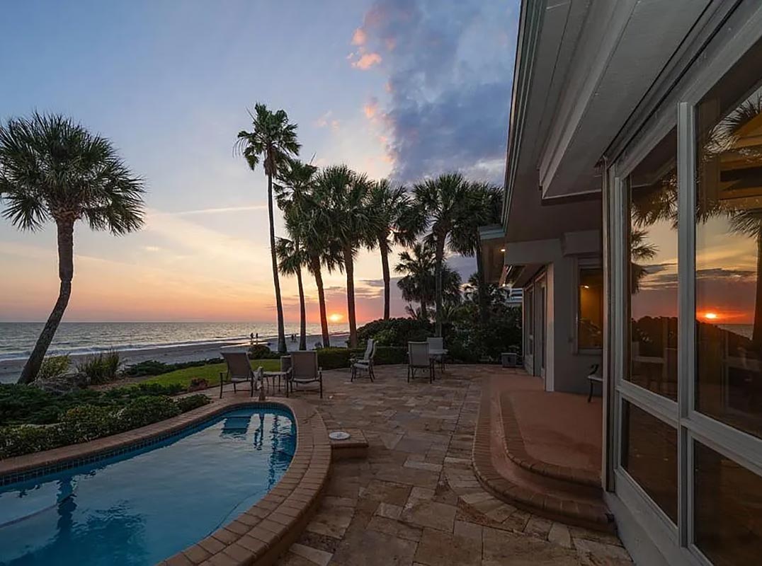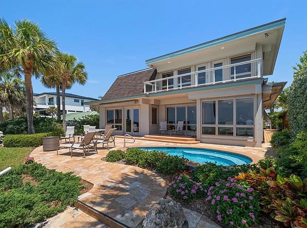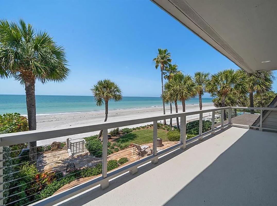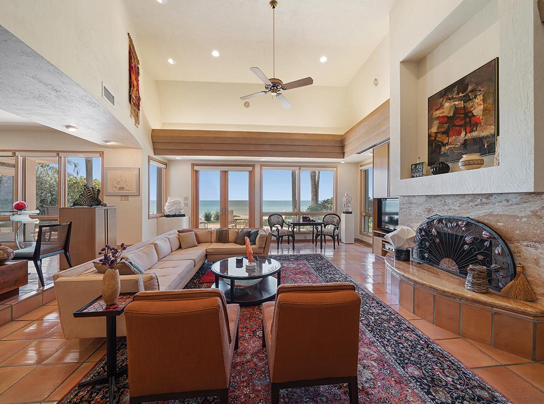 A BRILLIANT AND INCOMPARABLE FRANK LLOYD WRIGHT INSPIRED BEACHFRONT MASTERWORK! Designed by a 1959 Taliesin fellow and protégé of the renowned Frank Lloyd Wright, this remarkable mid-century estate breathes a unique and timeless elegance into the beachfront living experience. Its ingeniously-configured topography carries you gently to first floor living spaces that sit near ground level, yet rest a full 8+ feet above the waterline (no seawater has ever entered the living areas of this home). A lovely private courtyard yields to an inspiring, artisan-hand-crafted mahogany entry – hinting at the rarity of what’s to come. Step inside to the towering 18ft-high foyer and discover the true architectural splendor of the Wright vision. Well-conceived angles and clean structured patterns focused on consistency, practicality and livability - while mid-century in orientation - feel new, refreshing and exciting to the mind’s eye. French Parefeuille Terracotta tilework (uncommon at the time), innovative custom woodworking, harmoniously-integrated materials, extensive recessed lighting (well ahead of its time) and tasteful custom-textured wall finishes radiate a luxurious and vibrant allure! Overlooking the Gulf, your resplendent 15ft-high living area, with marble fireplace and custom entertainment center, features gorgeous and creatively-imagined built-ins that blend seamlessly into the environment - the definition of sophistication in form and function. Step up to the graceful waterfront dining area with beautiful built-in serving center - a genuine showpiece. Kitchen offers fine recessed ceilings, granite surfaces, superb cabinetry, Subzero/Thermador/Bosch appliances, hidden pocketing doors, and a terrific casual Gulf front breakfast nook. Magnificently-adorned in wood, the grand multi-function executive library will inspire your intellect and your senses. The home’s exquisite flying staircase introduces an impressive beachfront owner’s suite with expansive sitting area, and custom built-in credenzas. Step out to the private, covered, 23ft-wide owner’s balcony and take-in commanding, panoramic views of the beach and Gulf. Extraordinary owner’s bath enjoys two oversized walk-in closets with built-in dressers, separate his and hers vanities with dazzling marble surfaces, a dedicated sit-down cosmetics center, a richly-encased jetted spa tub, a private shower enclosure, rest room with bidet, mini-fitness area with skylights, and extensive auxiliary storage. Second upper-level bedroom suite is spacious, while the large first floor bedroom can be made ensuite (on demand) with adjoining guest bath. Full size 4th bath is the ideal pool bath. Your elevated back yard area is just heavenly. Perfectly landscaped to preserve your beach/water views, you will appreciate the substantial travertine paver deck, heated spool (spa/mini-pool), and generous space for lounging and outdoor dining. From your 8ft-high seawall/retaining wall - a private, gated staircase with outdoor shower descends to the beach level. This remarkable home has so many value-added extras including, electronic storm shutters, electronic interior window treatments, a 17ft-wide built-in greenhouse, 200sqft concrete block storage area, tankless HW heating, whole house water softening, dedicated workshop, and so much more. An ageless and enduring coastal marvel! Dimensions are estimates, buyer to verify.