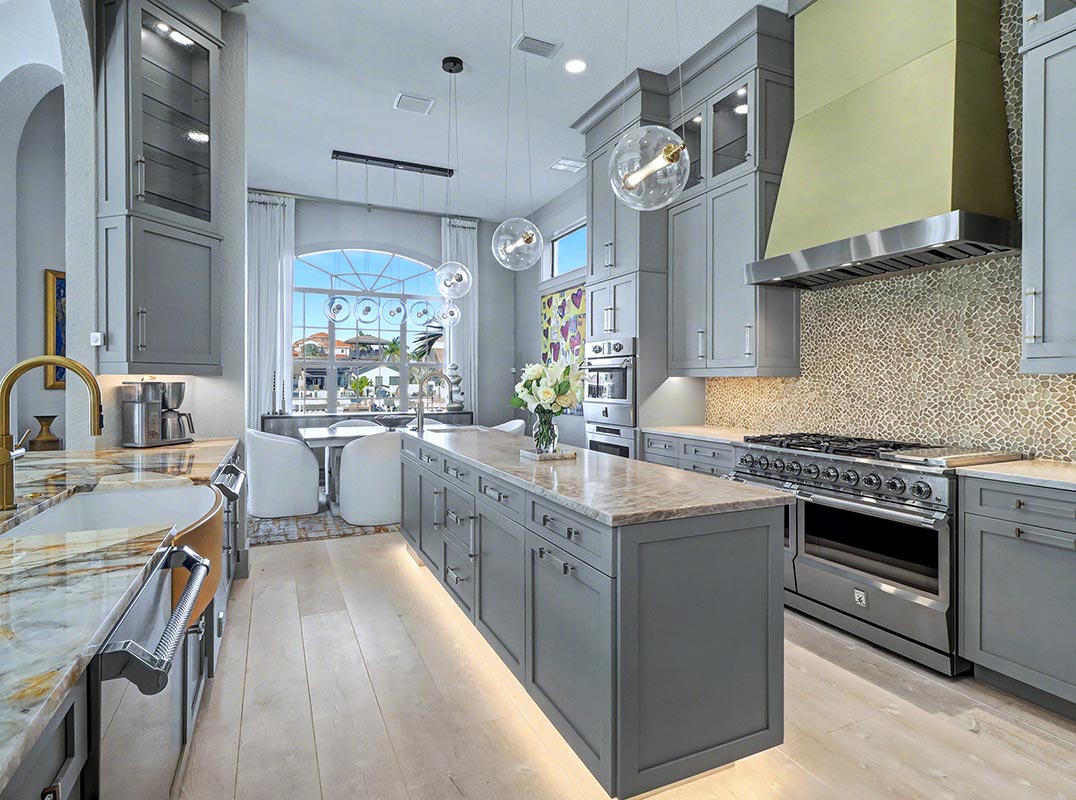 Step inside and discover an open-concept design accentuated by soaring 12-foot ceilings and pristine white oak hardwood flooring that flows seamlessly throughout. The heart of this home is undoubtedly the chef's dream kitchen, featuring top-of-the-line professional Heston appliances, stunning granite and stone countertops, and a double island perfect for entertaining. Culinary enthusiasts will delight in the double dishwasher, gas cooktop grill, three ovens, and a custom gold range hood, all complemented by an elegant pebble stone backsplash and a charming eat-in dining area.