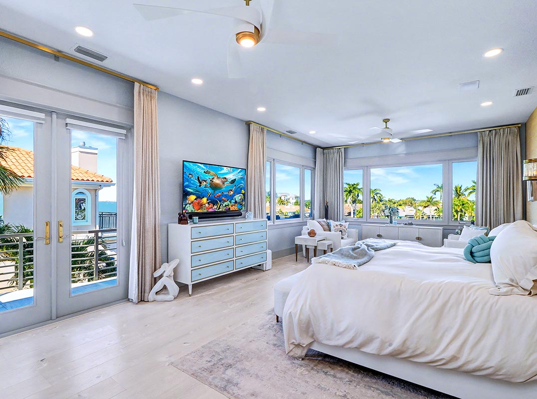 Ascend to the luxurious primary suite, a true sanctuary featuring mesmerizing water views, a private sitting area, and an exclusive balcony perfect for savoring morning coffee or evening sunsets. The opulent primary bath is an indulgent retreat, complete with a freestanding soaking tub with a ceiling-mounted faucet, a spacious two-person shower with a rain shower head, two custom vanities, and a generously sized walk-in closet with cabinet lighting, plus the added convenience of a second washer and dryer. A dedicated workout room further enhances this home's exceptional offerings.