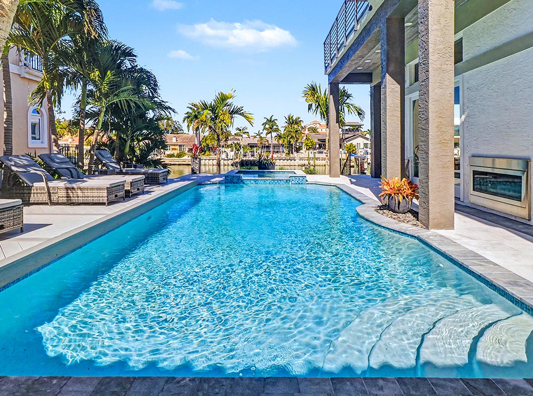 The expansive living room invites relaxation with its elegant wet bar and a captivating double-sided glass fireplace, offering warmth and ambiance. Enjoy tranquil pool views that blend effortlessly with the sparkling bay. The main level also thoughtfully includes a dedicated office space and a comfortable guest bedroom, ensuring convenience and privacy.
