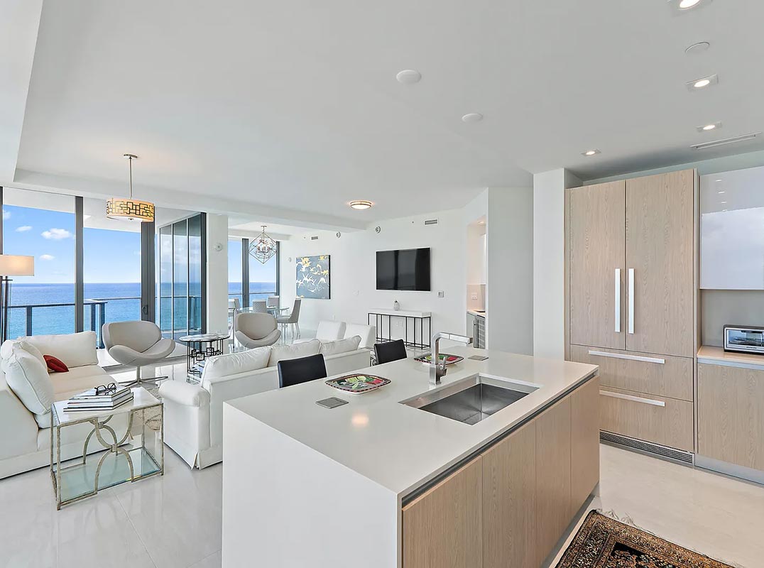 Floor-to-ceiling impact sliders lead to an expansive terrace, from which ocean views abound. The gourmet European kitchen is appointed with premium Miele appliances, quartz countertops, wine fridge, and full wet bar. Amrit residents enjoy first class amenities; beachfront cabana service, two oceanfront pools, hot tubs, yoga terrace, and a full-service spa including cutting-edge wellness amenities.