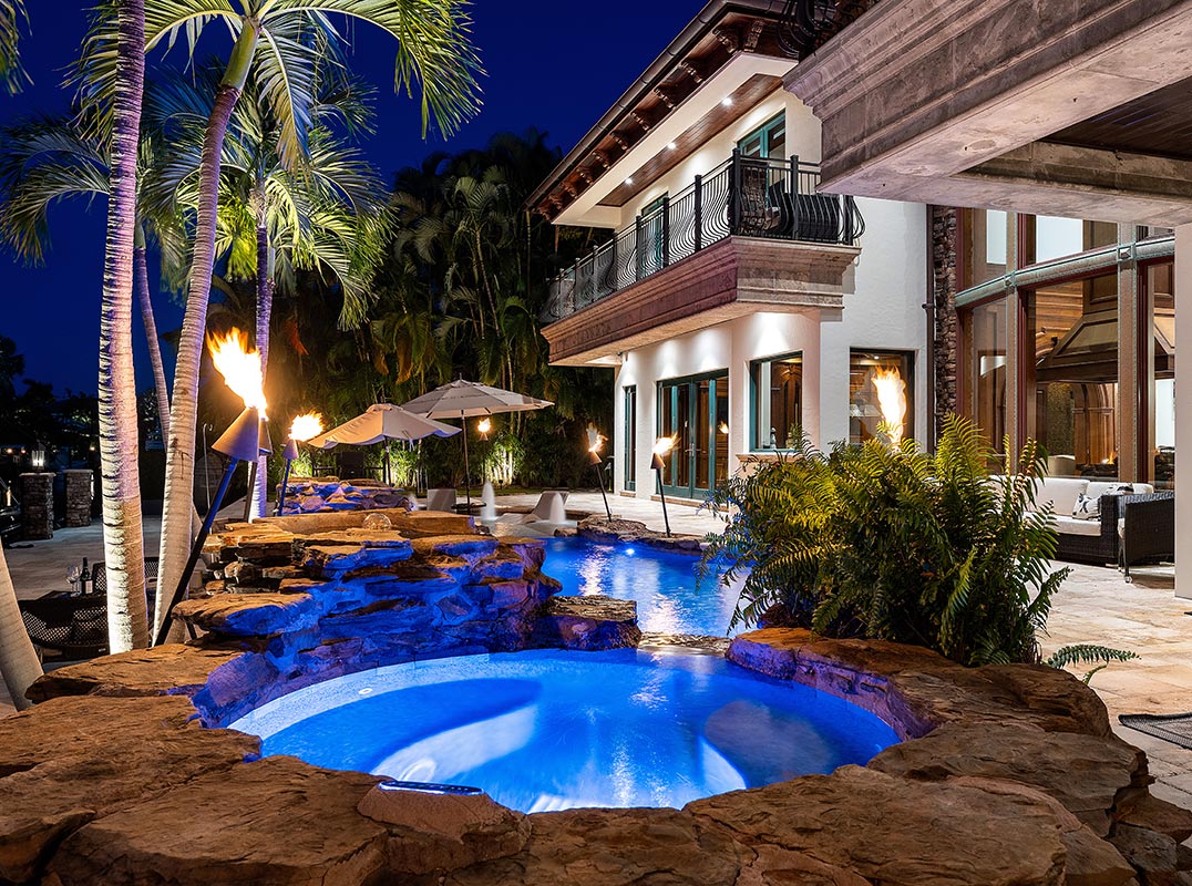 Outside, the home transforms into a private resort: Outdoor kitchen & dining, a saltwater ozone-purified lagoon pool with beach entry, waterfalls, dual grottos, spa table, oversized Jacuzzi, and putting green. A sun shelf with jets and sculptural fire features creates an ambiance of dramatic luxury, while multiple covered loggias extend the living experience.