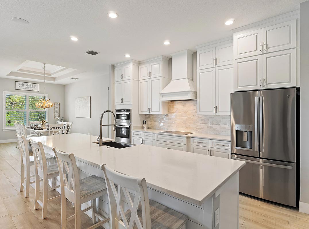 With 2,833 square feet under air (4,088 total), the home is thoughtfully designed with four bedrooms, three baths, and exquisite finishes including wood-look tile flooring, plantation shutters, impact windows and doors, a metal roof, and soaring 12-foot coffered ceilings beneath a 10-foot beam roof. The chef's kitchen is a showpiece, featuring a seating island, wet bar, and walk-in pantry, complemented by a formal dining room for entertaining. Retreat to the spacious master suite, where a glamorous spa-like bath and custom built-in closets provide everyday indulgence. Practical details abound, from the laundry room with ample storage to the reverse osmosis water system.