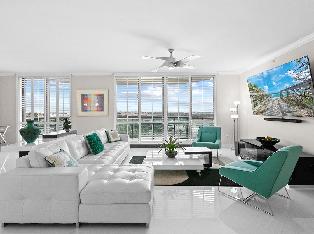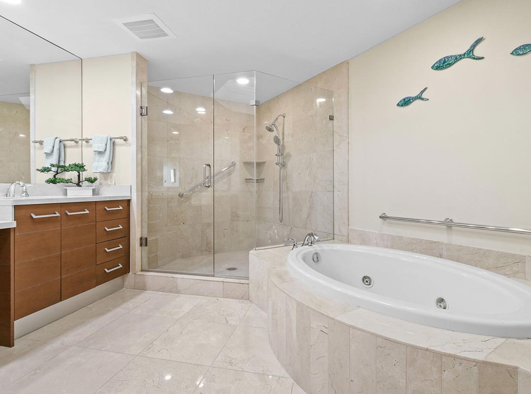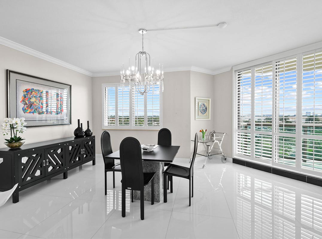Interior enhancements include 30' diagonal porcelain tile, plantation shutters, impact windows & doors, crown molding, solid-core doors, & modern lighting & fans. The primary bath is a serene retreat w/ a jetted tub, double vanity, Toto Neorest toilet & marble tile. The home also offers 2 new Bosch A/C units w/ smart auto-drain & UV light, newer LG washer/dryer, custom built-ins in every closet, & an office complete w/ built-in desk, cabinetry & Murphy bed. The spacious balcony is finished w/ durable stamped composite flooringperfect for relaxing outdoors.