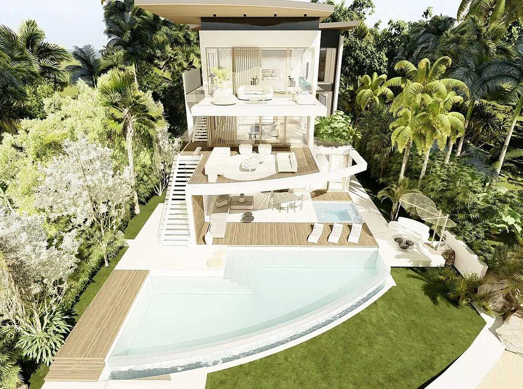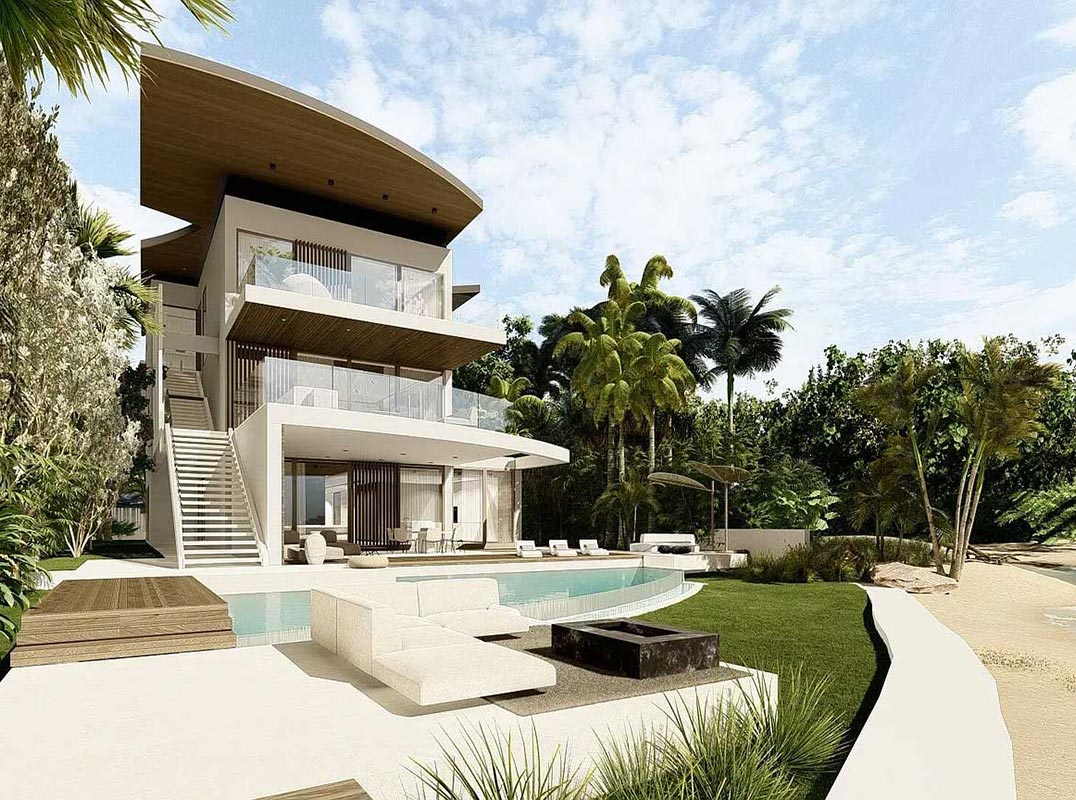 This organic modern jewel on a walled and gated lot along Billionaire's Beach takes privacy, security and world-class amenities to a whole new level. Three of them, in fact. The ultimate beach house (now under construction and slated for completion in the spring of 2026), new Villa Tropezina is being masterfully developed by Sabal Development and artfully crafted by Sabal Luxury Builders, both under the direction of Pascal Nicolai. It was beautifully designed by Togu Design. Ensconced on a lush linear sloping lot that extends from a pristine Atlantic Ocean Beach to a secluded Intracoastal inlet, this fluid, light-infused, three-story smarthouse juxtaposes organic finishes and creamy natural tones with modern design to create a zen-like serenity. From its water garden side entry and floor-to-ceiling sliders to its tiered water-view terraces and the Saint Tropez vibe of its beach-side cabana, this estate skillfully complements its island environ, while seductively blurring the line between indoor/outdoor living.