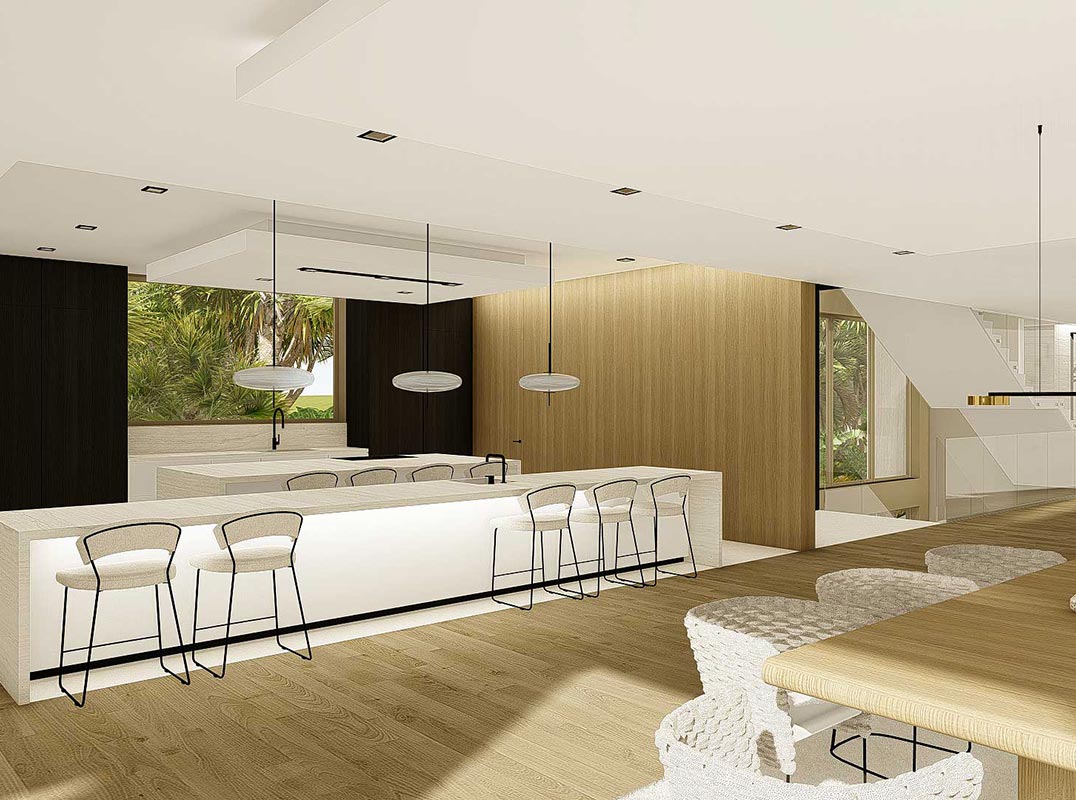 Main Level: The double door side entry opens to an expansive foyer with a dramatic concrete floating staircase, and a tone-on-tone creamy white interior infused with light and further warmed by organic wood treatments. The open-plan west wing is comprised of: a living room framed on two sides by floor-to-ceiling glass, enriched by wood flooring and ceiling treatment, looking out through a covered terrace to an island-like view of a serene waterway framed by palms; an open gourmet island kitchen with custom cabinetry, extensive casual dining bar, wine cellar, walk-in chef's kitchen and pantry; a formal dining area; and the elevator. The east wing encompasses: a VIP oceanfront guest suite, large screening room with built-in bar, and powder room across the foyer.