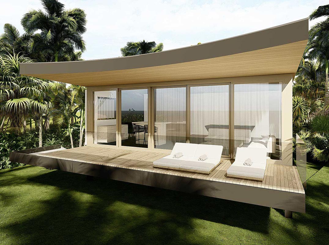 Beach Cabana: This zen-like cabana on pilings, ensconced on the ocean side of the property, encompasses a game room/lounge and full bath, as well as a snacking kitchen.