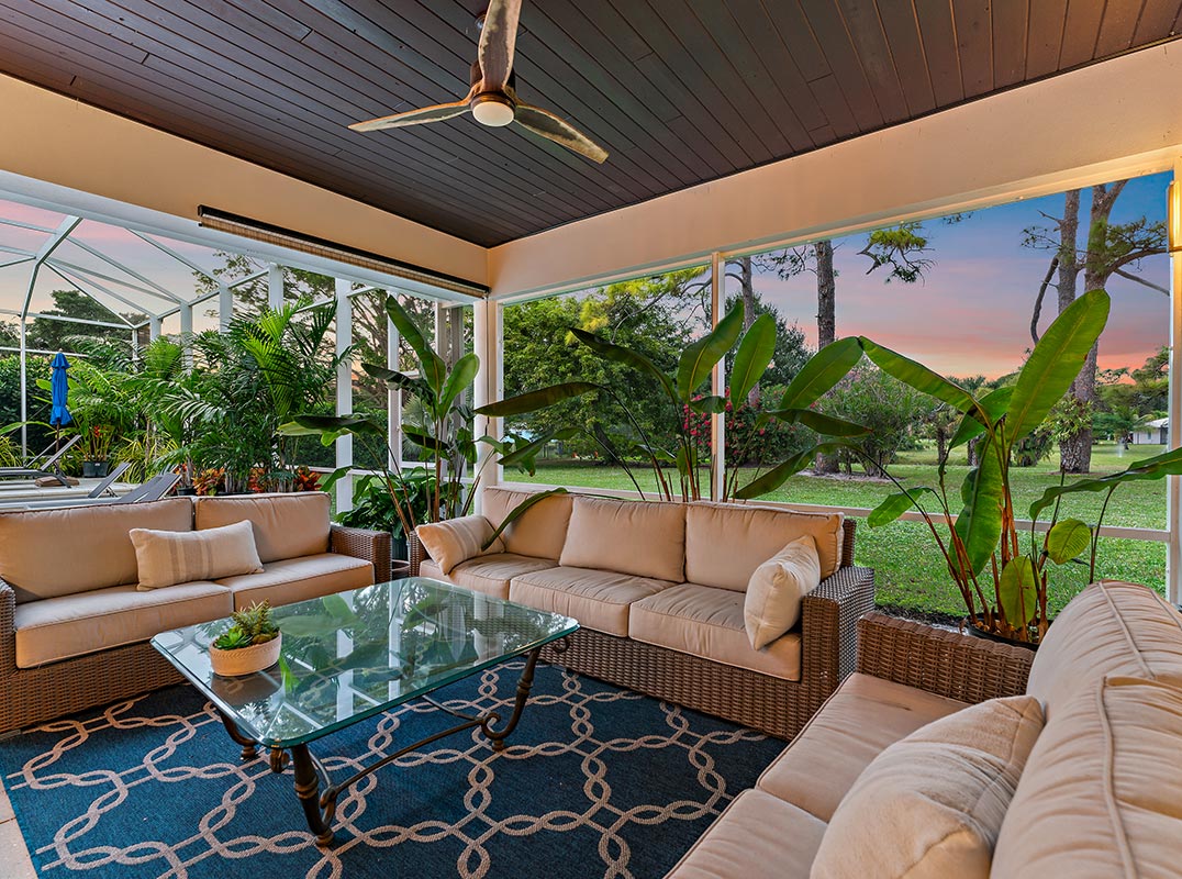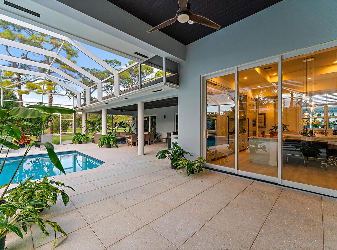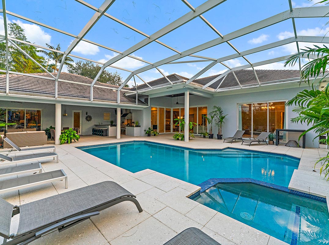 Step directly outside into the resort-style backyard offering a saltwater pool & spa, expansive covered and screened patio, outdoor kitchen and a gas fire pit.