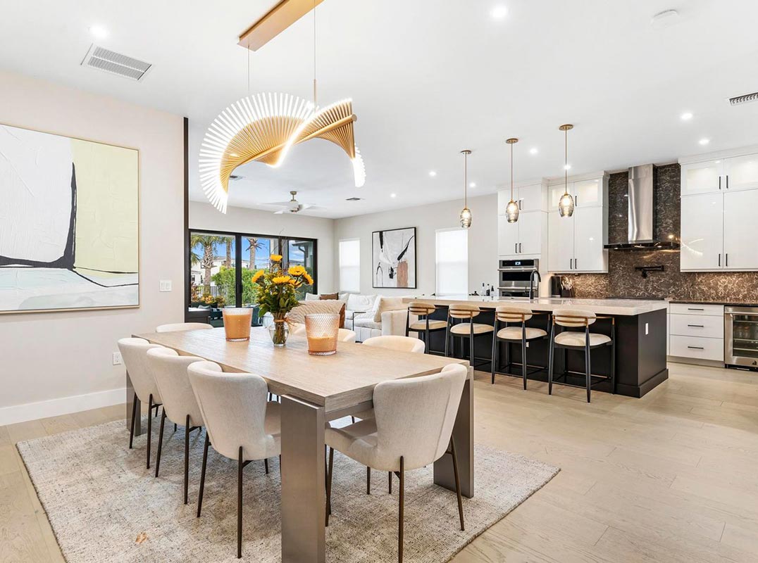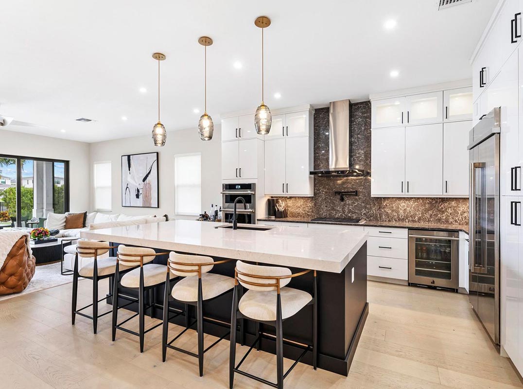 The chef's kitchen is a true showpiece, featuring Cristallo quartzite countertops, waterfall backsplash, 3" mitered-edge island, upgraded JennAir appliances, gas cooktop with hood, and pot filler. Smart-home automation, alarm monitoring, and full impact glass offer both convenience and peace of mind.
