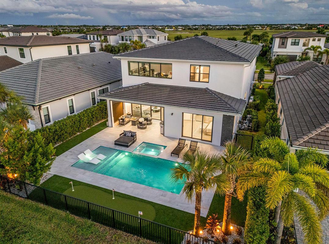 Features include a custom heated saltwater pool and spa, outdoor kitchen, retractable screens, and putting green. Over $500,000 in builder and designer upgrades, including custom lighting and fans, artwork, electric shades, upgraded baths, epoxy garage floor, upgraded cabinetry, central vacuum, and EV charging station.The elegant first-floor primary suite showcases two custom walk-in closets and sliding impact doors opening directly to the pool and spa. The north-facing backyard provides ideal sun exposure throughout the day. A custom home theater with projector and surround sound creates the ultimate in-home entertainment experience.