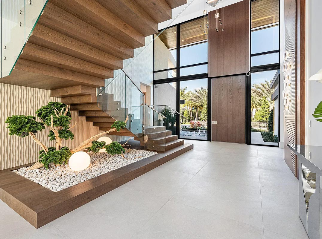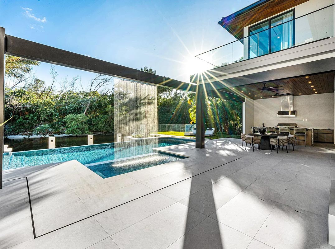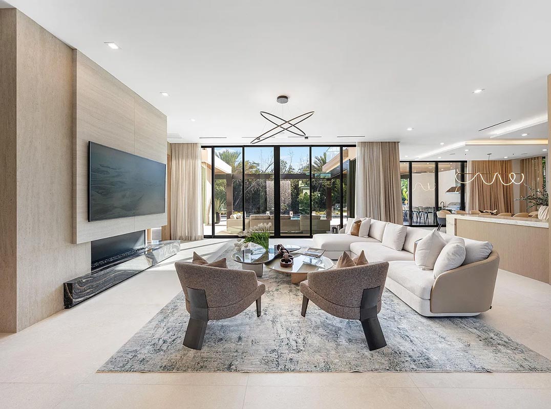 A refined club room with custom bar and pool table transitions seamlessly into a glass-enclosed office, creating a dramatic yet functional environment. At the heart of the home, a double-island chef's kitchen is appointed with top-of-the-line Miele appliances and complemented by a discreet butler's pantry, designed for both elevated entertaining and everyday living. Two laundry rooms provide thoughtful convenience. Materiality defines the interiors. Italian porcelain accent walls, a striking marble fireplace, and decorative fireplaces throughout elevate the architectural language, while sculptural water features both at the entry and cascading beside the resort-style pool create a sense of movement and tranquility.