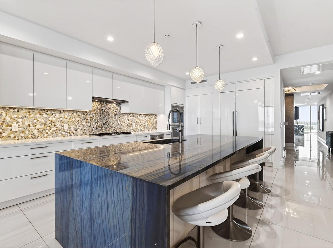 Entertaining spaces are thoughtfully designed and highly customized. The elegant great room opens to the spacious wrap-around balcony, offering breath-taking views of both the ocean and intracoastal waterway. The game/media room features an exquisite custom wet bar with waterfall edge finished in a stunning semi-precious stone that complements the custom cabinetry with display storage; paired refrigeration; stainless steel accents; and integrated lighting. The wet bar countertop was selected with intent to coordinate with the kitchen island to enhance design cohesion.