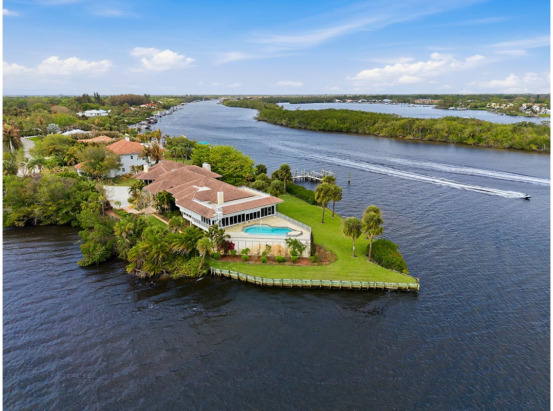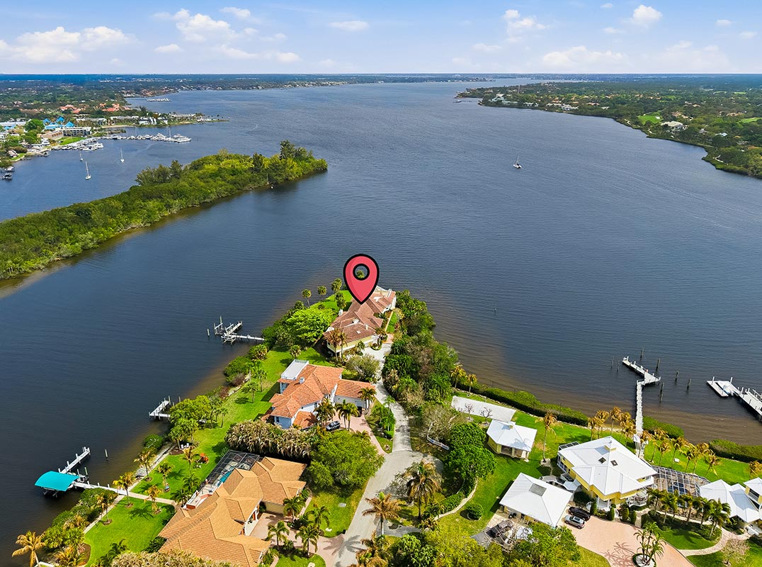 The Peninsula Estate is gracefully set upon more than an acre of land with approximately 650 feet of extraordinary water frontage, offering one of the most private and captivating waterfront settings along Florida's coveted Treasure Coast. Positioned on a rare peninsula within the exclusive gated community of Bay St. Lucie, the property is surrounded by sweeping panoramic views of the St. Lucie River, creating the feeling of a secluded island retreat. The residence encompasses over 8,467 square feet of refined living space, thoughtfully designed to capture the beauty of its surroundings. Elegant marble flooring, expansive living and entertaining areas, a gourmet kitchen, and a distinguished library with fireplace reflect both comfort and sophistication. Walls of glass frame spectacular .. river vistas from nearly every room, seamlessly connecting the interior spaces with the serene waterfront landscape. A separate guest residence offers private accommodations ideal for extended family or visiting guests. The estate's expansive grounds and remarkable peninsula setting present exceptional possibilities for a private family compound, executive retreat, or luxury waterfront sanctuary. Outdoors, a private docks w/30,000 & 10,000lb boat lifts and resort-style pool overlook the tranquil waters of the St. Lucie River, completing this extraordinary waterfront offering. The Peninsula Estate represents a rare legacy property where privacy, scale, and natural beauty converge.