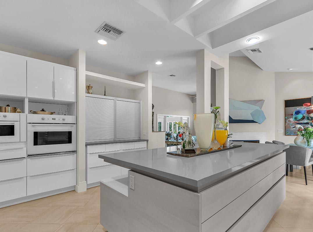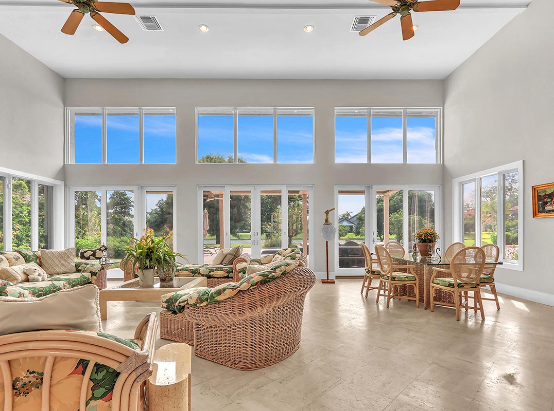 Designed for both grand entertaining and comfortable everyday living, the thoughtful crafted floor plan features generous living spaces enhanced by tasteful updates throughout. A contemporary kitchen and a striking double-sided fireplace elegantly adorns the main entertaining spaces. Soaring volume ceilings and an entire wall of windows frame exquisite lake views to create perfect Florida indoor/outdoor living.