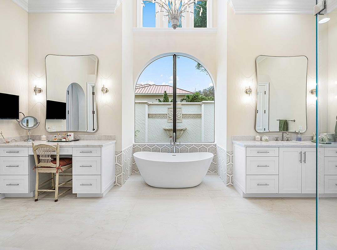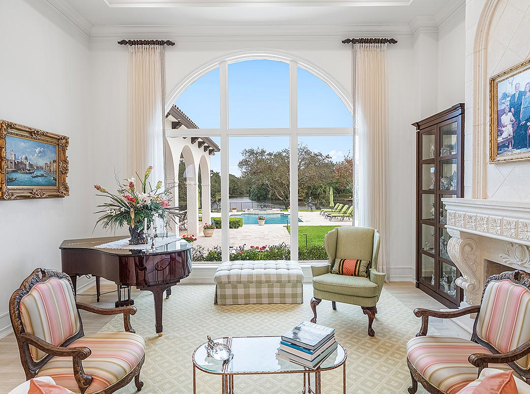 The primary suite is a true private retreat, complete with a spacious sitting area framed by arched windows that capture serene lake views. Two newly updated primary en-suite bathrooms featuring sleek glass showers, a soaking tub with a picturesque window view, new vanities, and updated flooring. The suite also includes an exercise or hobby area with a juice bar and two large custom walk-in closets.