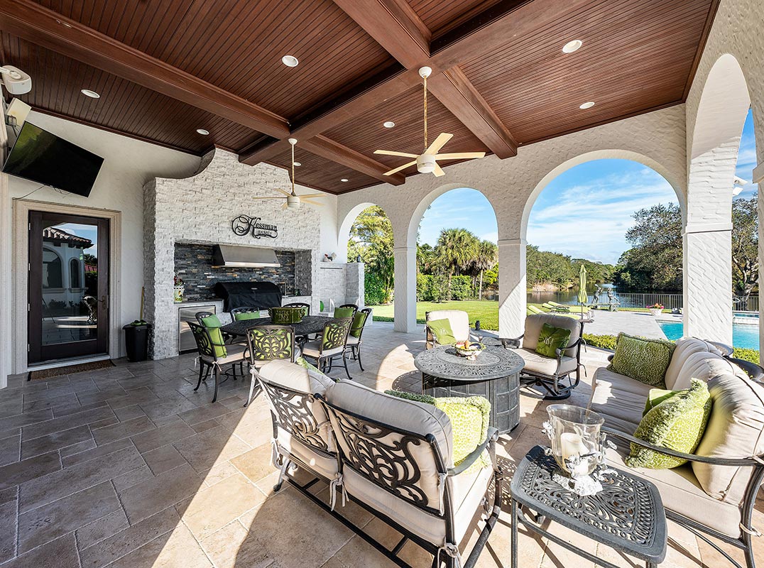 The gourmet kitchen, upgraded in 2022, is a chef's dream, boasting rich wood cabinetry, granite countertops, expansive center island and top-of-the-line appliances including Sub-Zero, Thermador, Bosch, and Dacor. Offering Florida indoor/outdoor living, steps away see the wall of sliders spanning the rear of the home to allow effortless entertaining in the expansive covered loggia with a summer kitchen, gas BBQ, and Sub-Zero fridge, all overlooking the stunning pool, spa, and cascading water features enhancing the serene experience. New pool, summer kitchen, waterfall and patio in 2022.