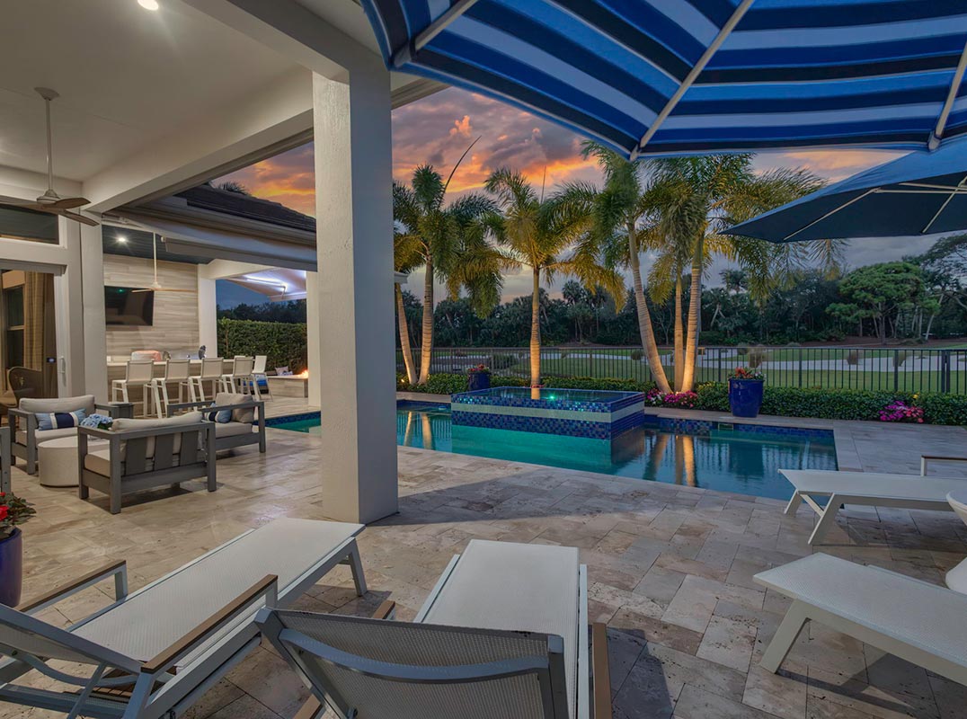Situated on an expansive lot of nearly one-third of an acre, the backyard offers a sense of openness and flexibility rarely found in the community. A generous patio, custom fire pit with built-in seating, and outdoor kitchen create an ideal environment for entertaining, relaxing, or enjoying Florida's year-round indoor-outdoor lifestyle.