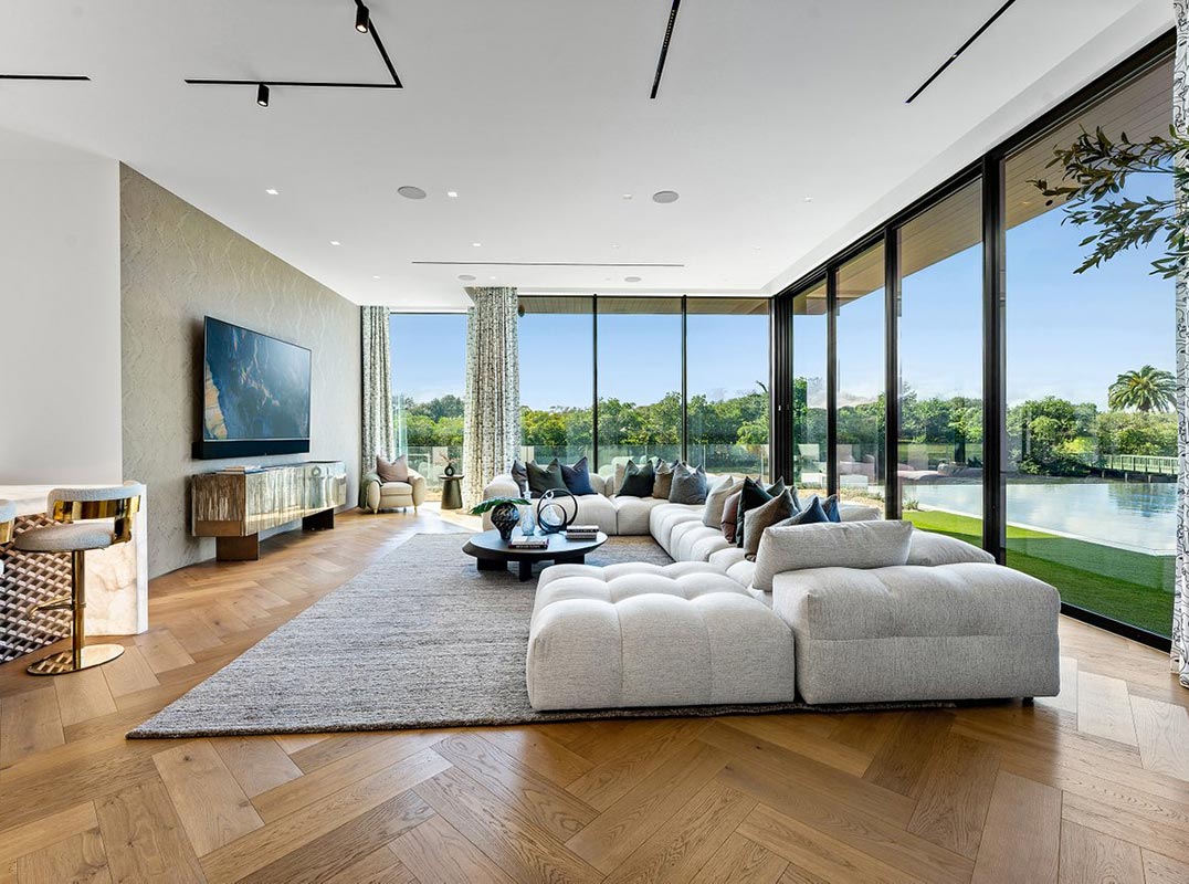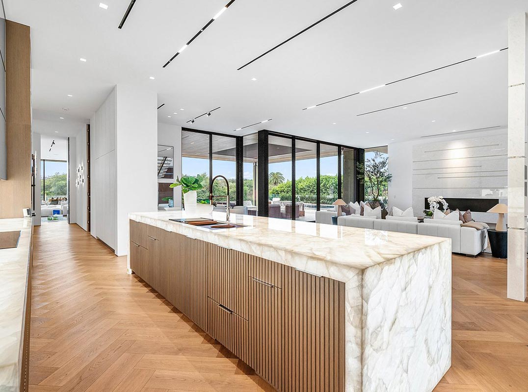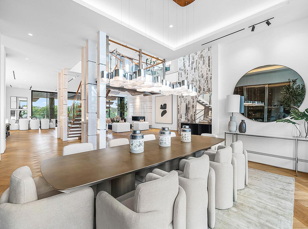 A dramatic travertine and silver-leaf feature wall welcomes you, while the floating Cristallo staircase serves as a striking architectural centerpiece. Offering approximately 9,971 SF under air and 12,600 SF total. The home features 5 bedrooms including a first-floor primary suite, 6.1 baths, MAFI Austrian wood floors, and exceptional craftsmanship throughout. Two designer kitchens include a chef's kitchen and a stunning show kitchen with illuminated Cristallo quartzite countertops Ultra-high-end Eggersmann cabinetry, professional-grade appliances, and a custom coffee center define the designer kitchen. The primary bedroom is a serene retreat with La Finestra glass walls opening to the spa and pool, plus a spa-inspired bath with backlit agate countertops, integral stone sinks, dual water closets, freestanding soaking tub, titanium-tiled shower, and two custom walk-in closets.