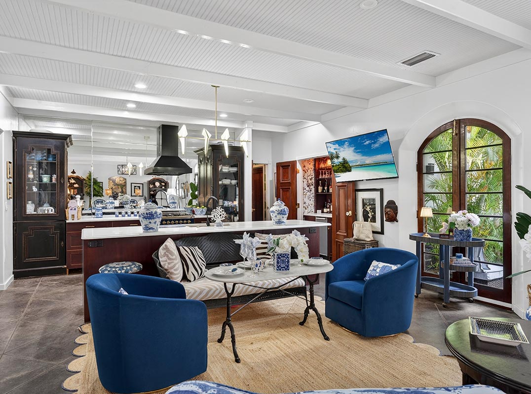 West Indies–inspired 3BR/3.1BA residence just steps to private beach access, renovated in 2018. A charming garden courtyard welcomes you into this private island retreat. Bright, open interiors blend timeless architecture with updated finishes and effortless flow. Lush tropical landscaping surrounds the pool, creating a secluded resort-style setting. Covered lanai with southern exposure centers around a fireplace, ideal for outdoor living. Additional highlights include an outdoor shower and climate-controlled garage. A rare blend of character, privacy, and relaxed coastal elegance.