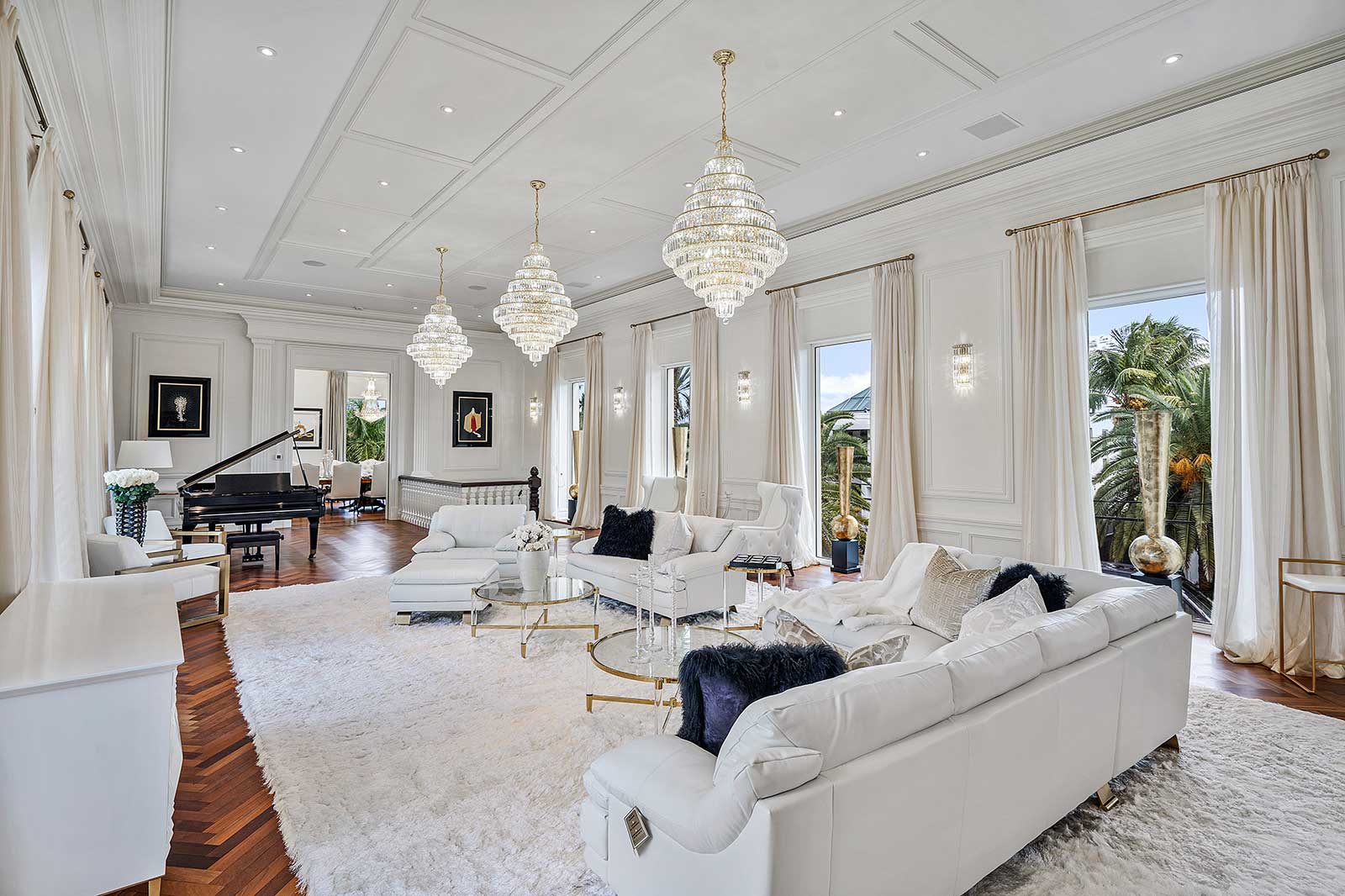 The waterfront mansion features glamorous chandeliers throughout, with stunning finishes in the bathrooms and kitchens. Featuring beautiful millwork throughout the home and grand staircases providing the most elegant touches. Even hidden passages throughout the home make this mansion a unique gem!