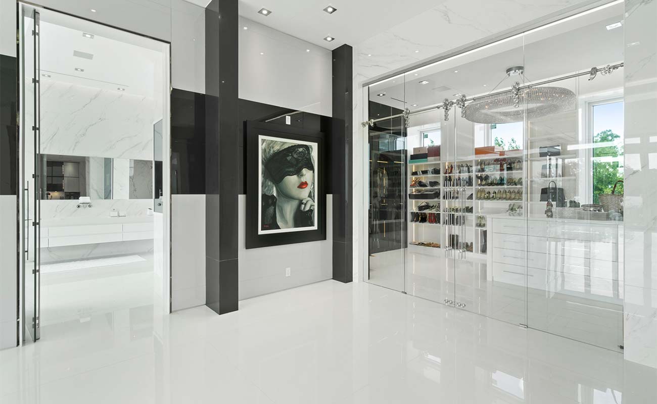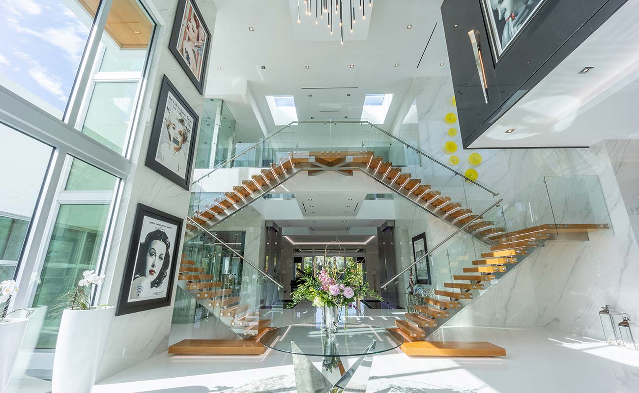 No expense was spared in creating this pinnacle of modern luxury living. The interior living area boasts five suites, seven full and two half bathrooms, a professional gym with steam shower, professional hair, makeup and nail salon, wine room, home theater, guest house with two suites, and three indoor kitchens.