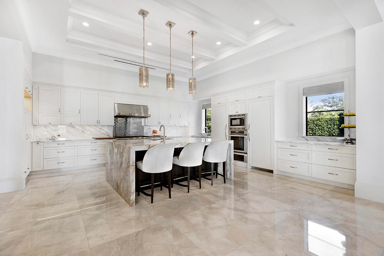 The ASID award-winning kitchen features custom cabinetry, professional appliances, and spectacular marble counters. The Family Room features floor-to-ceiling pocketing doors that open to the pool deck. Light streams through additional full-length French doors leading to the East Loggia, for seamless indoor-outdoor living.