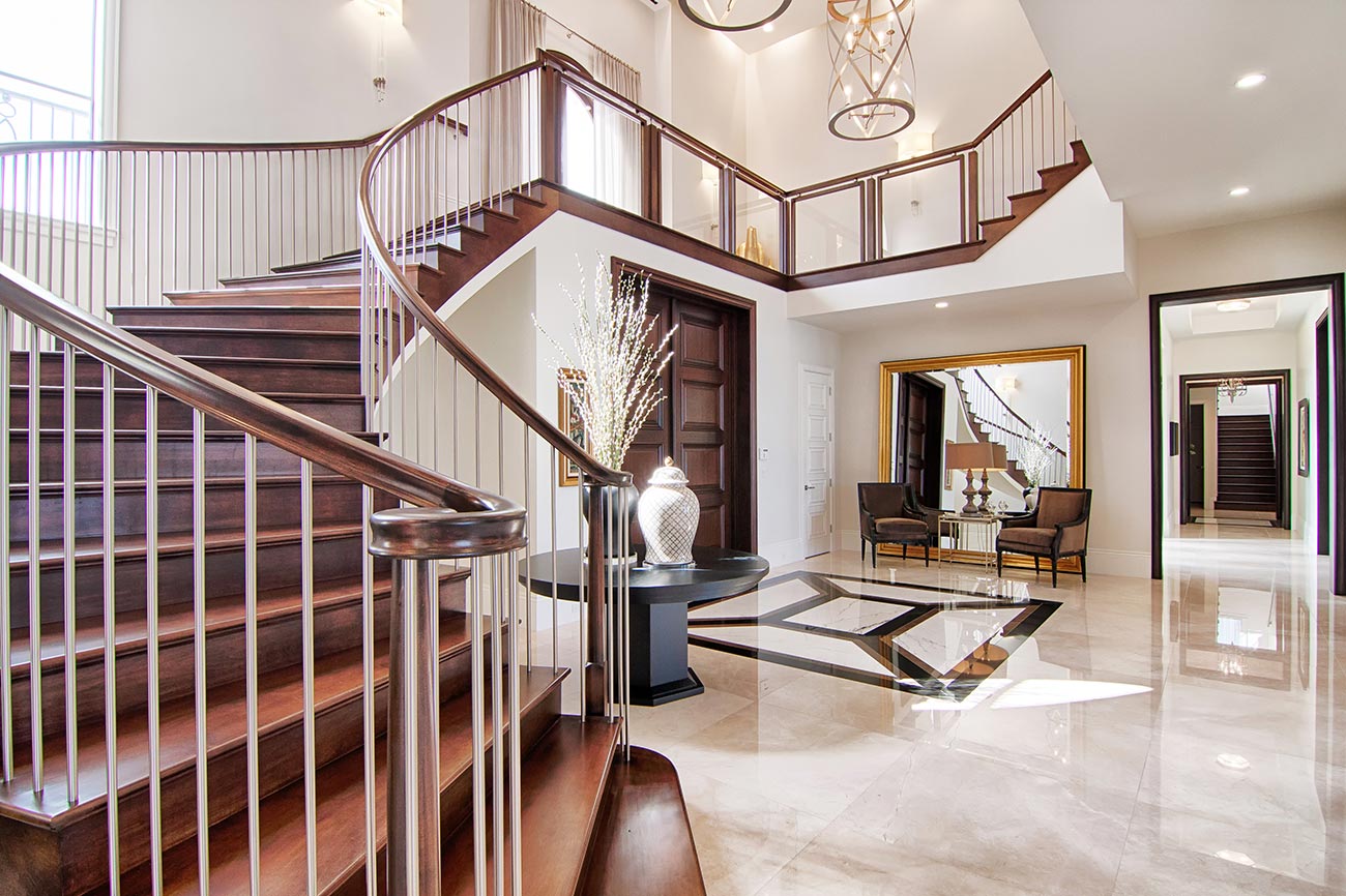 Enter the soaring foyer through 12-foot tall mahogany doors, and behold wide water views of the river beyond.