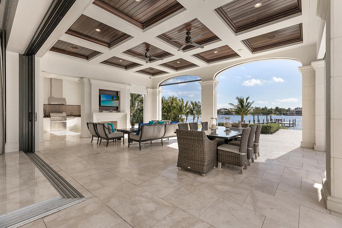 The plein-air Great Room is furnished with an outdoor kitchen, complete with bar, a stone fireplace, lounge seating, and a dining area with retractable screens for year-round enjoyment. A covered loggia, on Eastern façade, provides additional lounging areas. The terrace wraps around the saltwater pool, which features a shallow lower level.