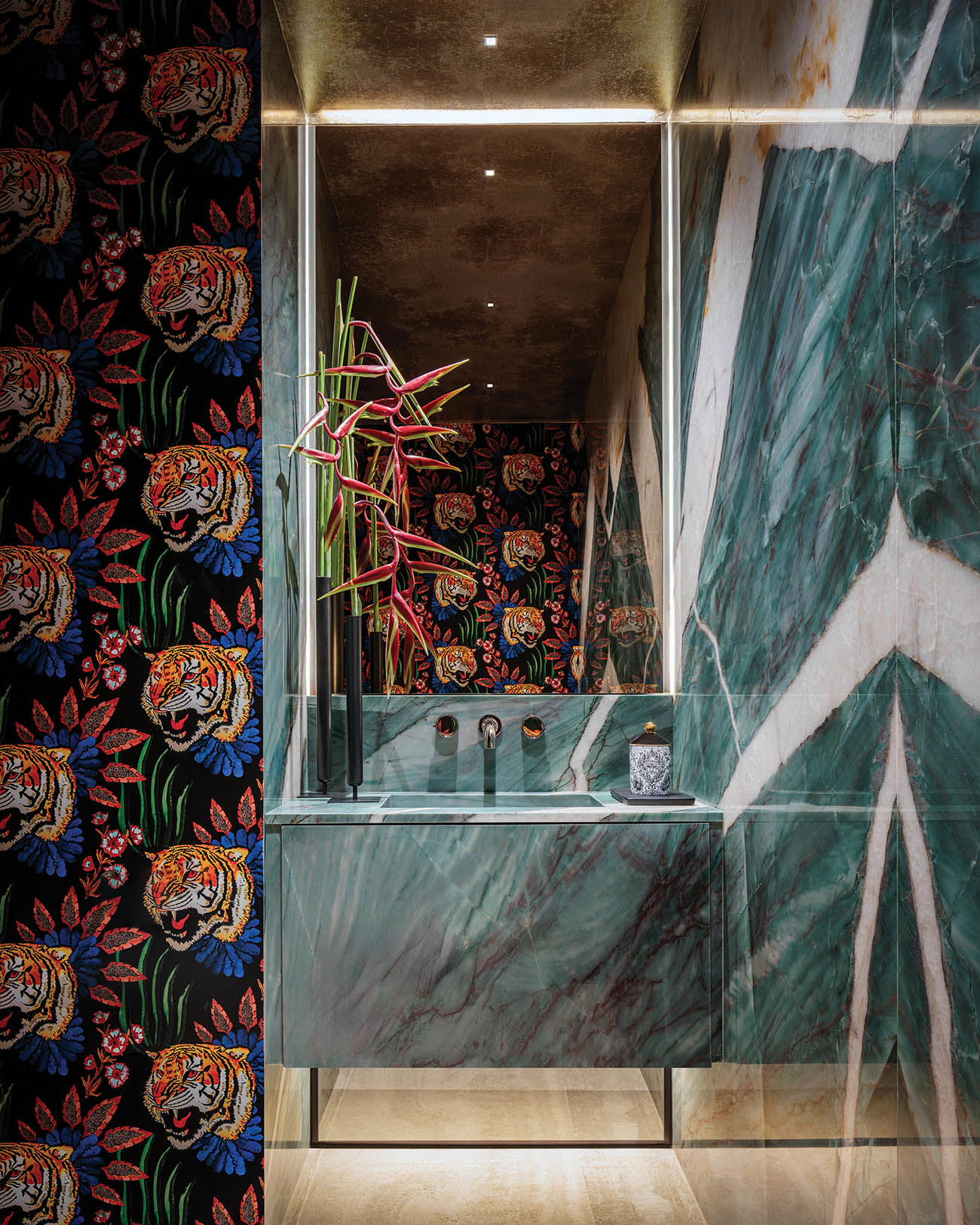 A distinct departure from the main living spaces, the powder room was designed as a jewel boxâcompact, bold, and unexpected â with the Super Crystal Verde quartzite as the main feature. The smoked mirror and gold foil ceiling expand the space visually, while Gucci wallpaper adds a graphic contrast to the stone. âThis powder room is definitely not what you would expect in this home, and thatâs exactly the [rhetorical] pointâ says Genevieve. The integrated sink is carved from the same Super Crystal Verde quartzite and paired with the Bond collection faucet from Waterworks, combining function with sleek, tailored detail.