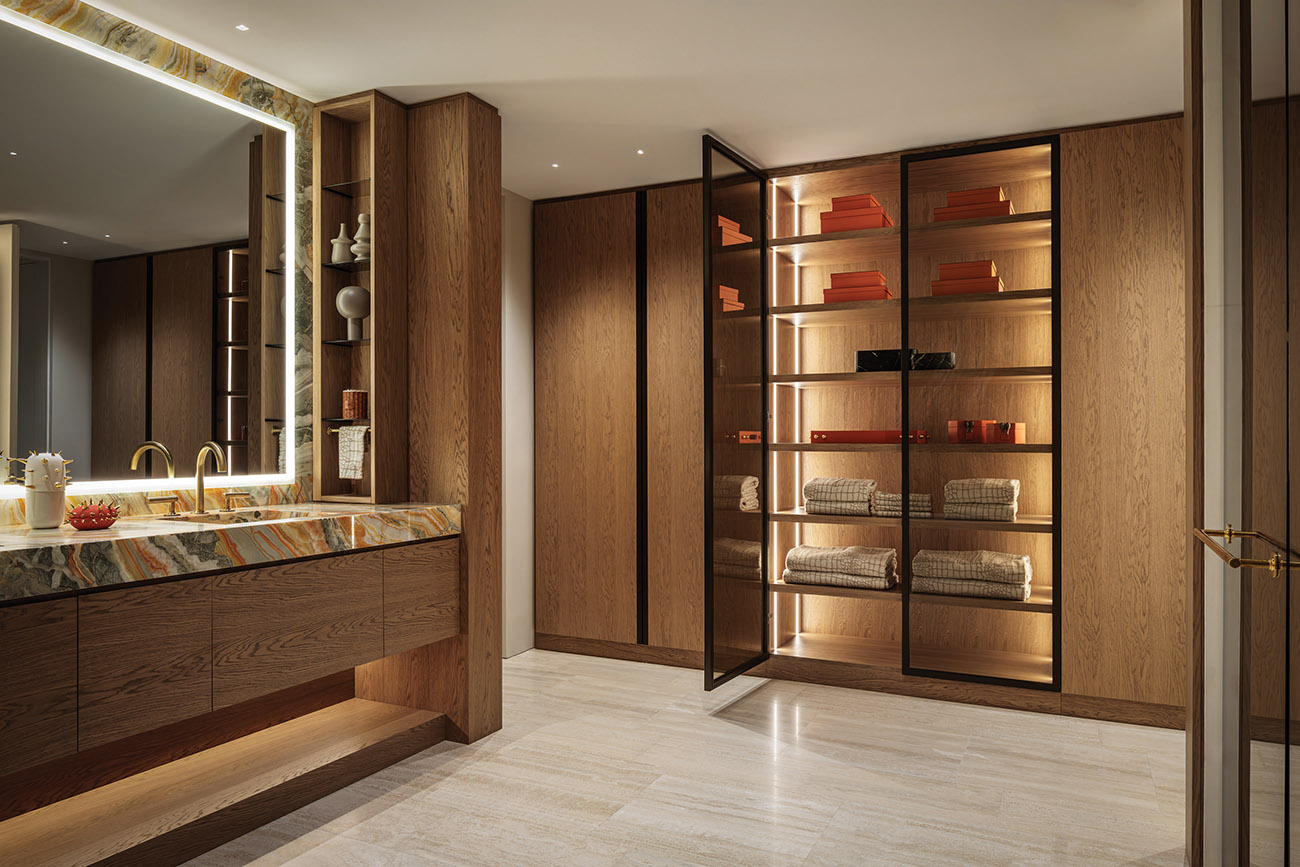 The primary bath and closet exude refined luxury, anchored by the striking Sage and Orange Onyx chosen by the client. Knowing the stone would be the star, the design team ensured every other element remained tonal and understated to let its bold veining shine. Oak wood cabinetry and Bond Waterworks fixtures bring warmth and balance, while tinted bronze glass adds depth and sophistication. Thoughtful detailsâlike the mirror with an integrated TV, speakers in the shower, and a custom closet with a central displayâcombine high-end functionality with serene elegance. The result is a spa-like retreat that feels both modern and timeless.